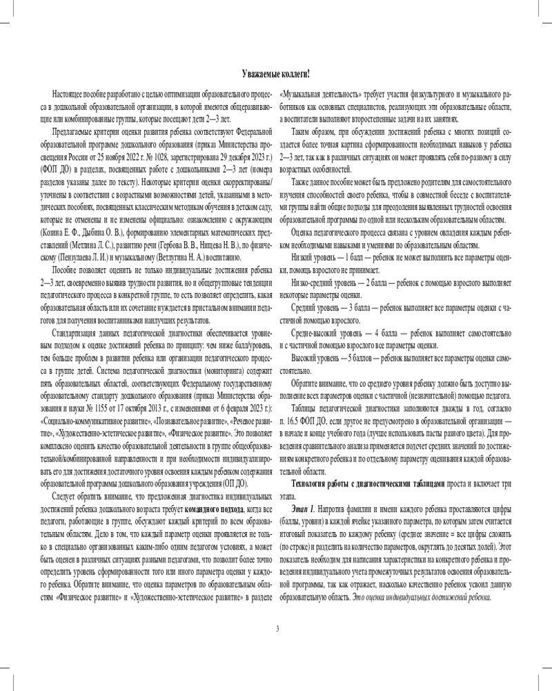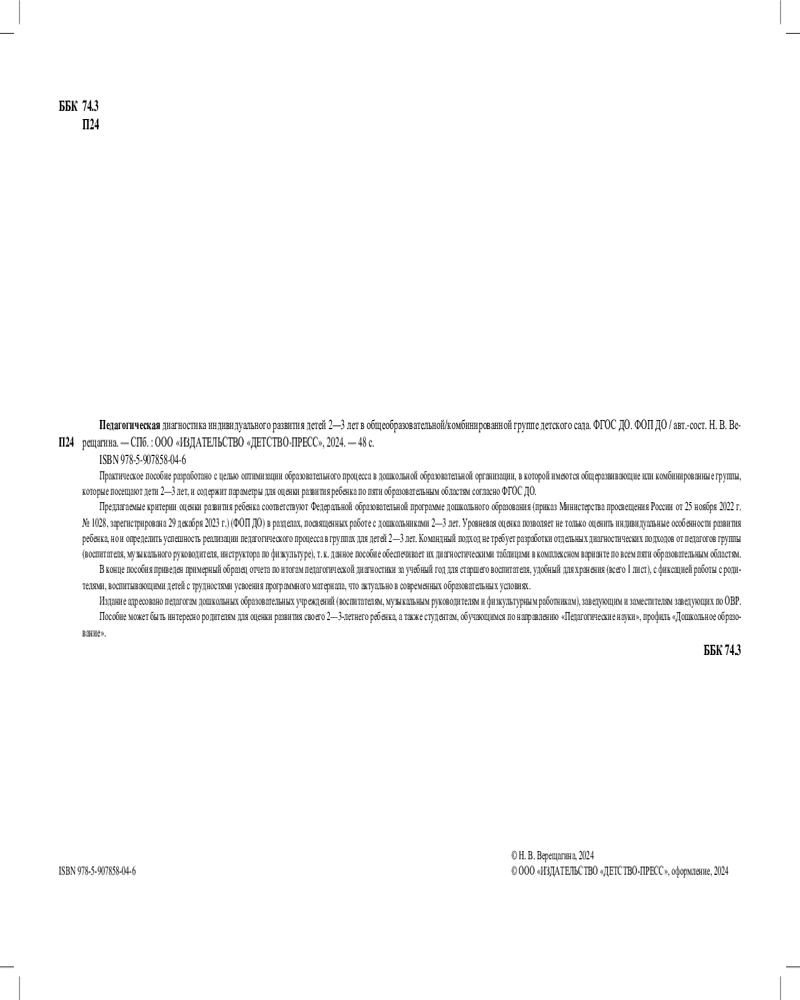 💳 Оплатить за товар можно при получении 🇰🇿 Есть бесплатная доставка по Казахстану от 1 дня 🎁 Копите бонусы с каждой покупки Практическое пособие разработано с целью оптимизации образовательного процесса в дошкольной образовательной организации, в которой имеются общеразвивающие или комбинированные группы, которые посещают дети 2-3 лет, и содержит параметры для оценки развития ребенка по пяти образовательным областям. Уровневая оценка позволяет не только оценить индивидуальные особенности развития ребенка, но и определить успешность реализации педагогического процесса в группах для детей 2-3 лет. Командный подход не требует разработки отдельных диагностических подходов от педагогов группы (воспитателя, музыкального руководителя, инструктора по физкультуре), т. к. данное пособие обеспечивает их диагностическими таблицами в комплексном варианте по всем пяти образовательным областям. В конце пособия приведен примерный образец отчета по итогам педагогической диагностики за учебный год для старшего воспитателя, удобный для хранения (всего 1 лист), с фиксацией работы с родителями, воспитывающими детей с трудностями усвоения программного материала, что актуально в современных образовательных условиях. Издание адресовано педагогам дошкольных образовательных учреждений (воспитателям, музыкальным руководителям и физкультурным работникам), заведующим и заместителям заведующих по ОВР. Пособие может быть интересно родителям для оценки развития своего 2-3-летнего ребенка, а также студентам, обучающимся по направлению «Педагогические науки», профиль «Дошкольное образование». |