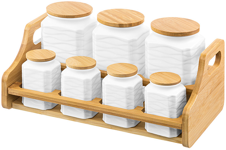 Благодаря силиконовому уплотнителю крышечка плотно прилегает к банке, что защитит продукты от пыли, предотвратит риск их рассыпания и сохранит аромат. Кухонный инвентарь на подставке можно хранить не только в шкафу, но и на столе и открытых полках. Удобно использовать для сухофруктов, орехов и даже мармелада. Посуда понравится любителям классического и скандинавского стилей. Банки для сыпучих продуктов с бамбуковыми крышками позволят не просто хранить чай, кофе и сахар на вашей кухне, они станут элементом её декора. Кухонные баночки выполнены в универсальном дизайне и подойдут к интерьеру в любом стиле. Храните соль, приправы и специи в одном месте, чтобы всё необходимое было под рукой. Комплект подойдёт для сервировки любых сладостей: джема, варенья и мёда.