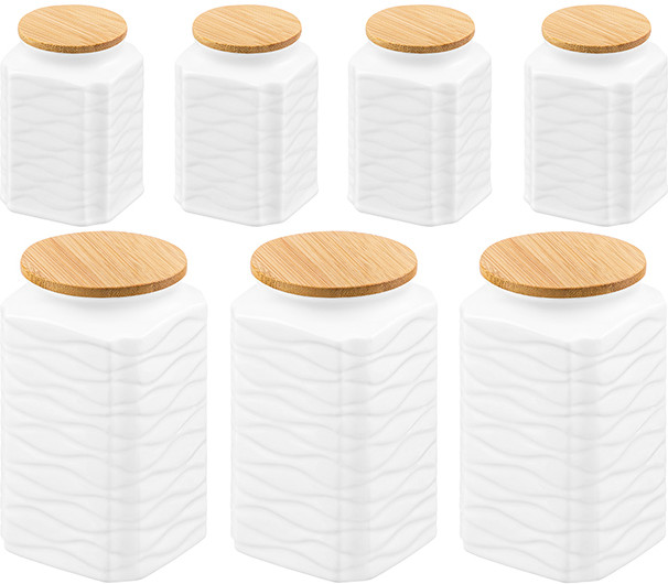В данный момент этот товар отсутствует в продаже. Возможно, у нас найдется аналогичный или похожий товар здесь. Серия: Айсберг волны Набор из 7 банок для хранения Elan Gallery «Айсберг волны» 31.7×17.7×15.5 см на бамбуковой подставке с ручками выполнен из белого фарфора и украшен рельефными узорами. В комплект входят 3 ёмкости по 600 мл (размер каждой 8×8×14.5 см) и 4 ёмкости по 150 мл (размер каждой 5.5×5.5×8.5 см). Размер подставки 31.7×17.7×12.7 см. Баночки имеют крышки из натурального бамбука с силиконовыми уплотнителями. Фарфоровые баночки станут удобным и эстетичным дополнением вашей кухни и позволят хранить любые продукты, например, перец, сахар или орешки.