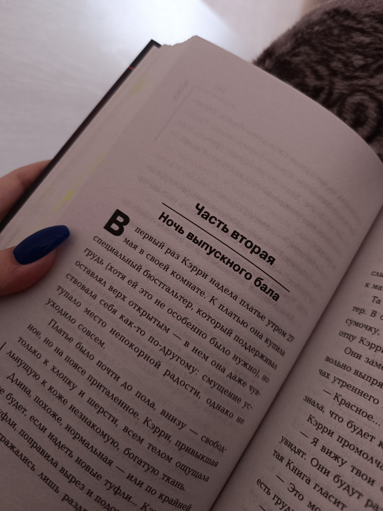 Полюбила чтение книг 2008 году когда экранизировали Сумерки. С тех пор я читала все бестселлеры которые экранизировали: Сагу Сумерки, Трилогию Голодные игры, Дивергент, Бегущий в лабиринте.....и даже 50 оттенков. Эти все истории замечательны. Но Кэрри уникальна! Я просто влюбилась в эту историю, в персонажа Кэрри. Советую всем и надеюсь вы полюбите ее так же, как и я! Кинг невероятный и умопомрачительный!