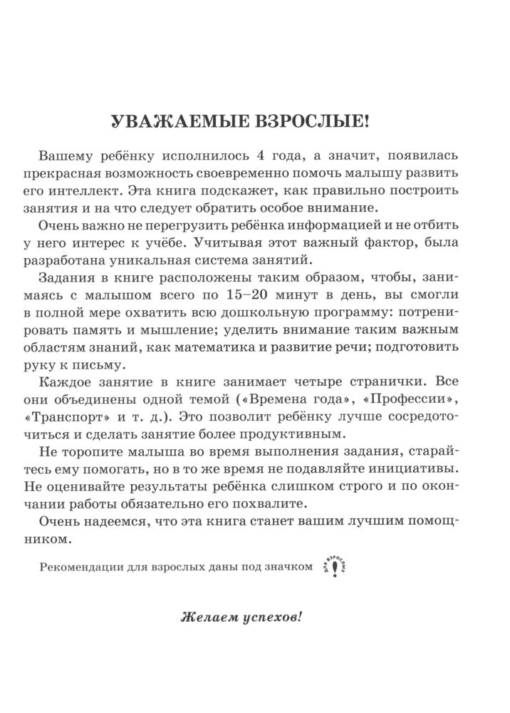 Книжка хорошая, как и все книги серии. Начали заниматься с умными книжками в 3 года, теперь в этом году взяли на возраст 4 года. И больше никаких других книжек и не нужно, в этой охвачено все. Разделено на занятия, каждое занятие по 4 страницы, очень удобно.