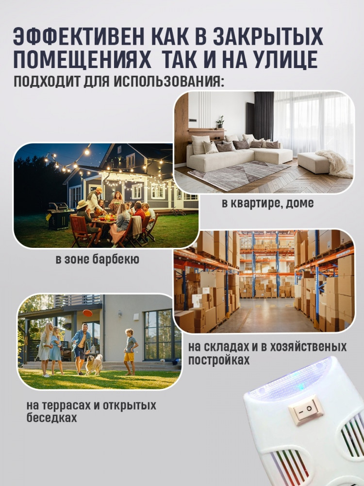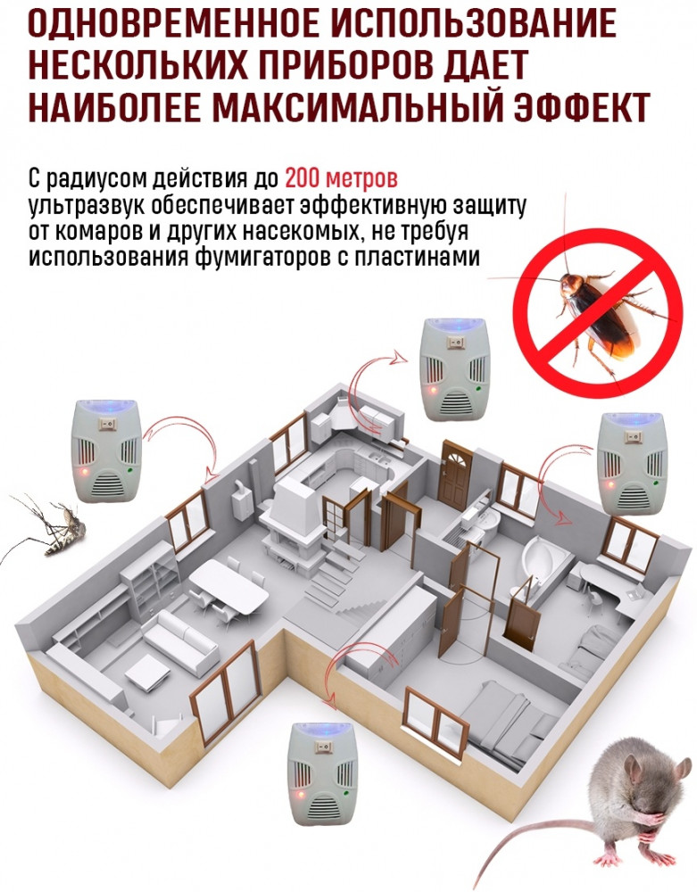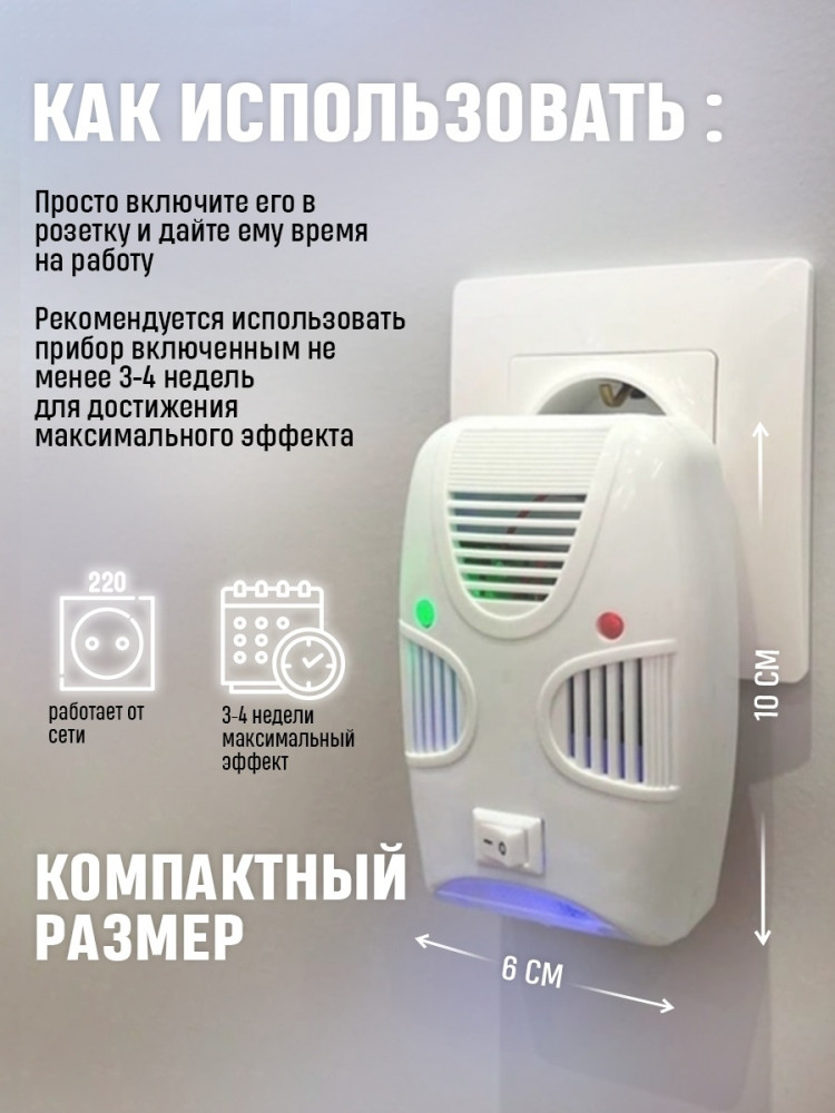 Способ применения: первое включение должно быть длительным – не менее 10 дней, чтобы избавить помещение от вредителей. После полного изгнания вредителей прибор включают для профилактики примерно 1-2 раза в месяц. |