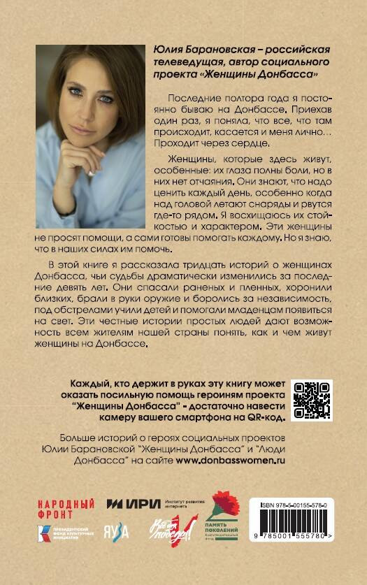 Серия: Истории сильных Последние полтора года я постоянно бываю на Донбассе. Приехав один раз, я поняла, что все, что там происходит, касается и меня лично... Проходит через сердце. Женщины, которые здесь живут, особенные: их глаза полны боли, но в них нет отчаяния. Они знают, что надо ценить каждый день, особенно когда над головой летают снаряды и рвутся где-то рядом. Я восхищаюсь их стойкостью и характером. |