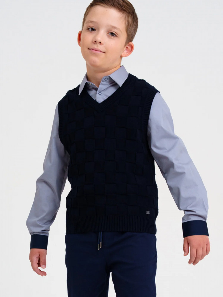 Классический синий школьный жилет для мальчика-подростка. Жилет прямого силуэта выполнен из вязаного трикотажа из 100% хлопка, что обеспечивает максимальный комфорт для школьника во время занятий. Жилетка в школу выглядит стильно благодаря лаконичному дизайну. Рубашка, футболка или поло плюс жилет для школьника составит красивый элегантный комплект для школы.
