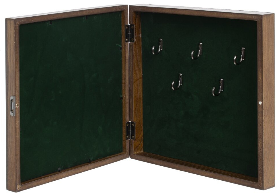 💳 Оплатить за товар можно при получении 🇰🇿 Есть бесплатная доставка по Казахстану от 1 дня 🎁 Копите бонусы с каждой покупки Серия: Вне времени Ключница закрытого типа с пятью крючками, изготовлена из пластика. Цвет коричневый с декором в виде ключа. Внутри отделана тканью под бархат. Закрывается на защелку. Крепится на стену с помощью двух металлических петелек. |