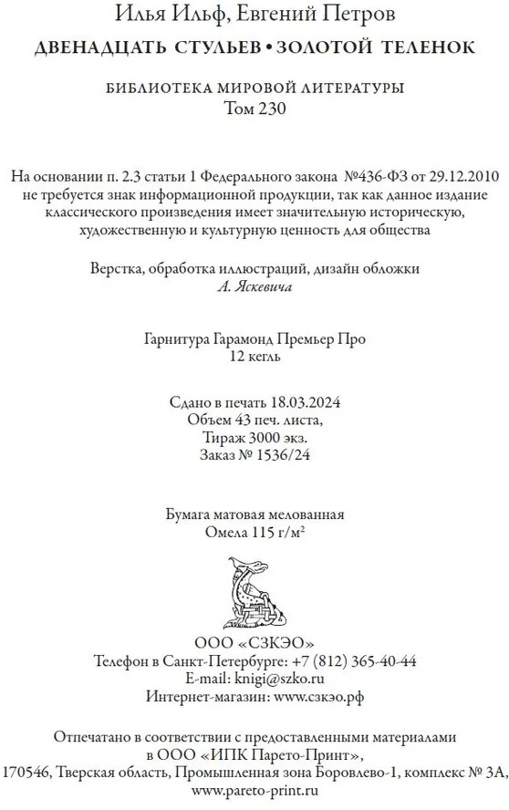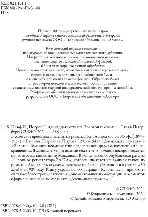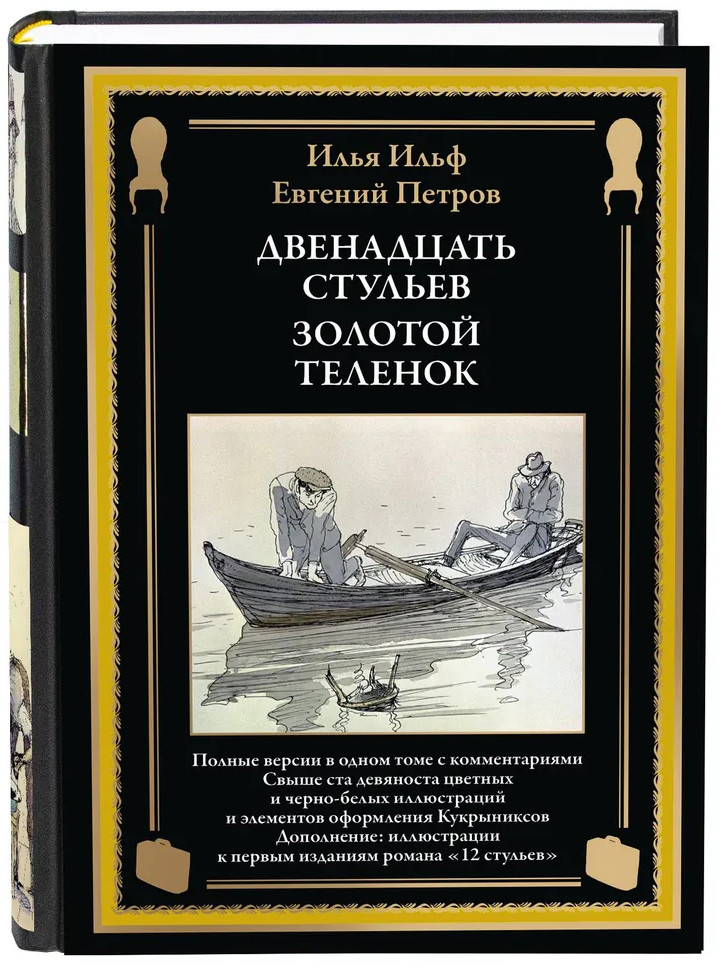 Серия: Библиотека мировой литературы В советское время два знаменитых романа Ильи Арнольдовича Ильфа (1897–1937) и Евгения Петровича Петрова (1902–1942) «Двенадцать стульев» и «Золотой Теленок» неоднократно подвергались правкам, изменениям и сокращениям. В данном издании полные тексты этих романов воспроизводятся по их первым книжным публикациям. В конце издания опубликован рассказ «Прошлое регистратора ЗАГСа», который является неизданной главой из романа «Двенадцать стульев»; впервые он был опубликован в журнале «30 дней» в 1929 году. Книгу украшают иллюстрации Кукрыниксов; приводится также более трех десятков их дополнительных иллюстраций и элементов оформления к первым изданиям "Двенадцати стульев«.