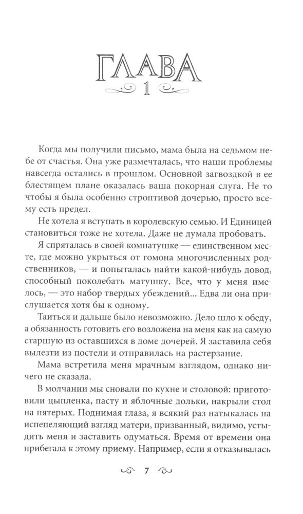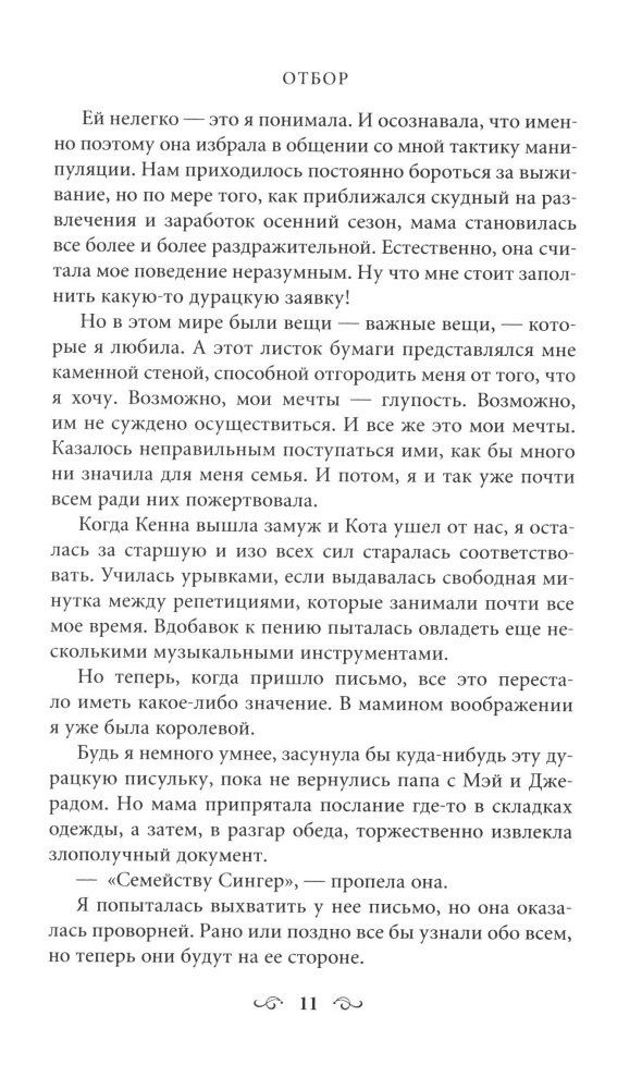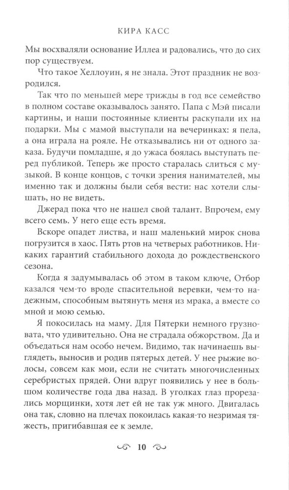 Я такой человек которому важно не только содержание книги, но и её характеристики. И эта книга меня не разочаровала. Обложка просто прекрасна, страницы белые, шрифт такой, какой нужен. Ну и конечно же содержание: книга прекрасно написана, сюжет затягивает, прочитала её на одном дыхании, теперь читаю элиту. Советую прочитать всем девушкам, я уверенна им понравится.