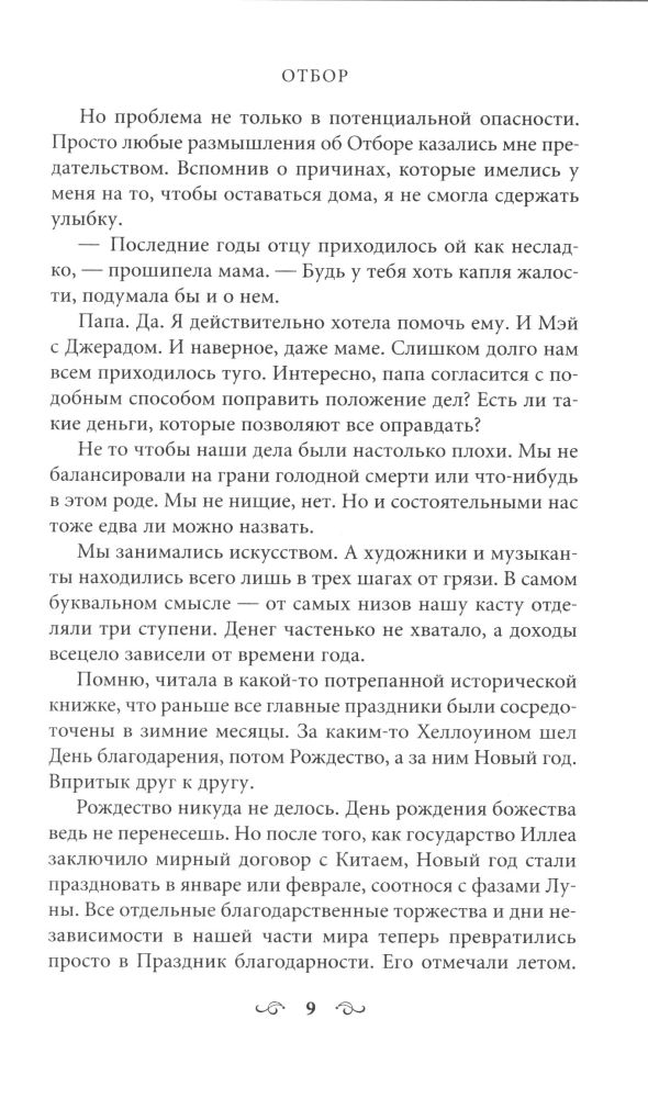 Качество книги отличное, страницы белые, шрифт нормальный. Очень интересный сюжет, прочитала всю книгу за 1 день. Так как это трилогия заказала 2 и 3 часть, жду не дождусь. Если будете заказывать закажите сразу 3 книги (Отбор, Элита и Единственная)
