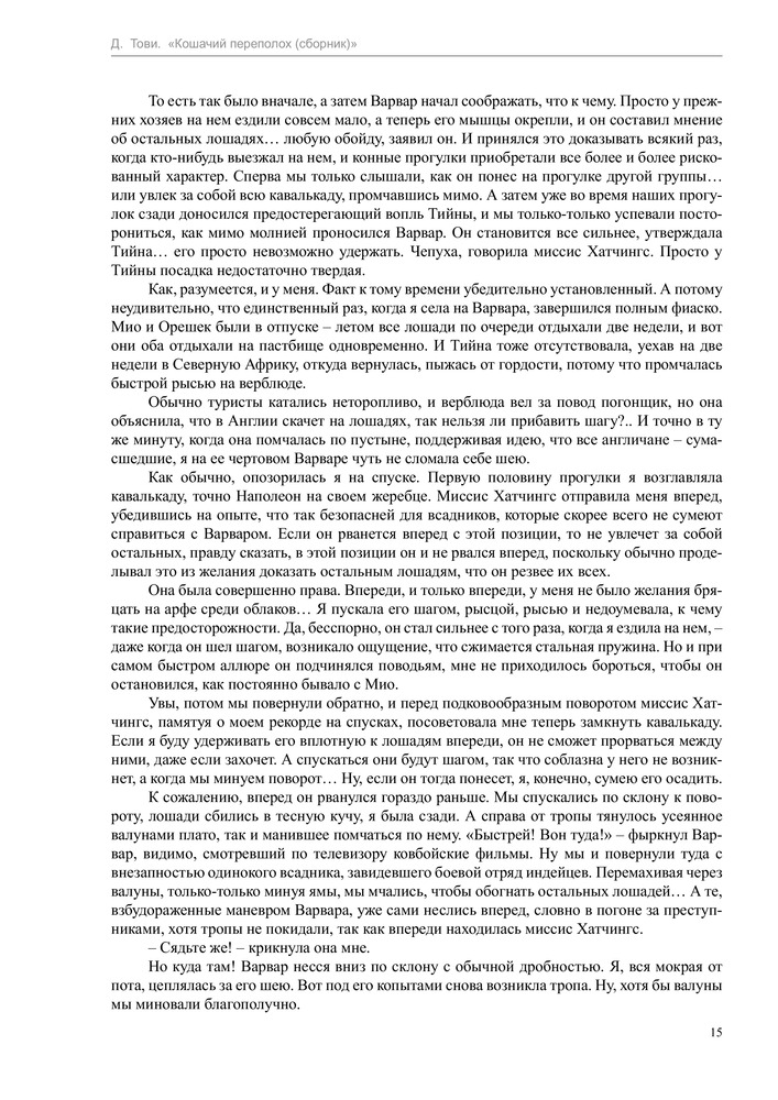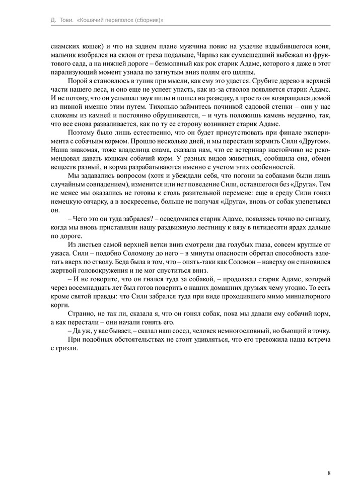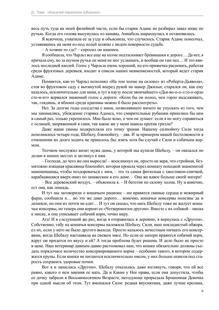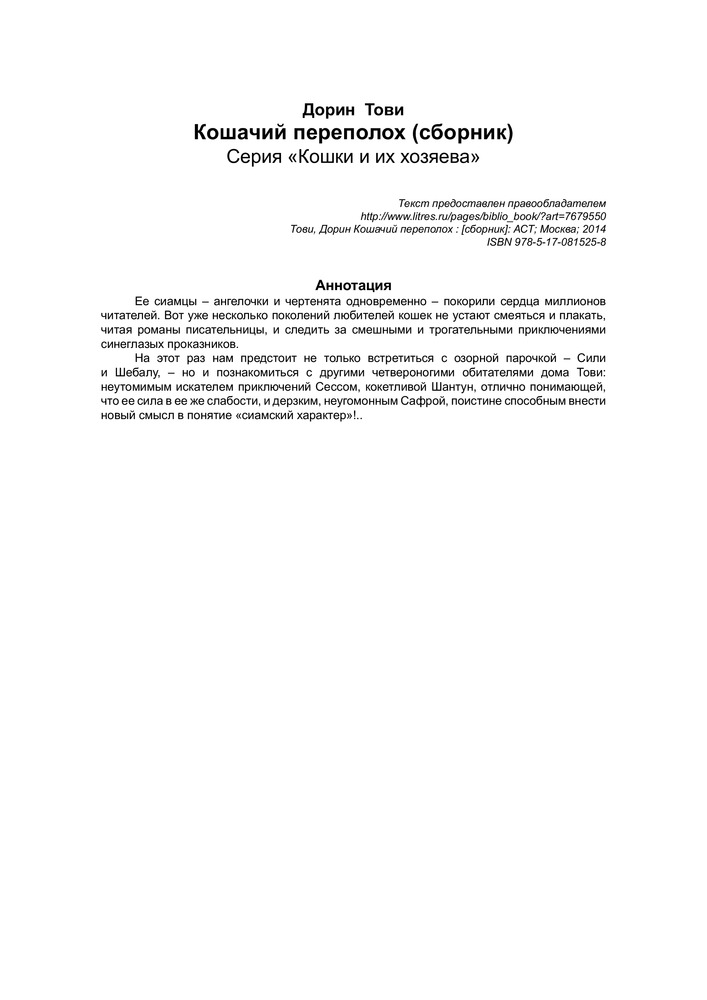 Кошачий переполохВ данный момент этот товар отсутствует в продаже. Возможно, у нас найдется аналогичный или похожий товар здесь. Серия: Кошки и их хозяева Ее сиамцы — ангелочки и чертенята одновременно — покорили сердца миллионов читателей. Вот уже несколько поколений любителей кошек не устают смеяться и плакать, читая романы писательницы, и следить за смешными и трогательными приключениями синеглазых проказников. На этот раз нам предстоит не только встретиться с озорной парочкой — Сили и Шебалу, — но и познакомиться с другими четвероногими обитателями дома Тови: неутомимым искателем приключений Сессом, кокетливой Шантун, отлично понимающей, что ее сила в ее же слабости, и дерзким, неугомонным Сафрой, поистине способным внести новый смысл в понятие «сиамский характер»!.. |