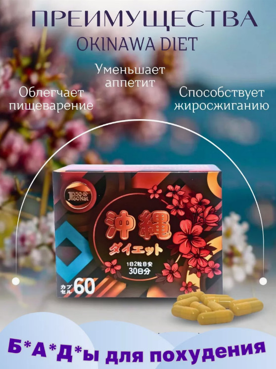 Капсулы для похудения «Okinawa Diet»В данный момент этот товар отсутствует в продаже. Возможно, у нас найдется аналогичный или похожий товар здесь. Хотите быстро сбросить лишний вес без ущерба для здоровья? «Okinawa Diet» — ваш идеальный выбор. Эта натуральная высокоэффективная биологическая добавка из Японии способствует сжиганию жиров и формированию стройной фигуры всего за несколько недель. Ее уникальное действие ускоряет метаболизм, повышает энергию и работоспособность. Изготовлена из природных жиросжигателей, формула направлена на «проблемные» зоны, такие как живот, талия и бедра. С помощью наших капсул вы можете потерять от 6 до 12 кг в месяц, сохраняя при этом комфортный образ жизни. Капсулы сжигают жир, устраняют целлюлит и дарят вам ощущение легкости. Эта добавка рекомендуется при ожирении, повышенном аппетите, низкой физической активности и нарушенном обмене веществ. Результаты превзойдут ваши ожидания. |