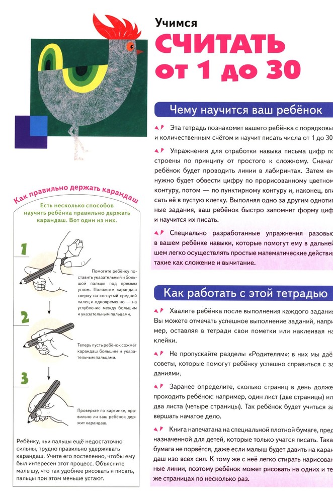 Тетрадь интересная, очень нравится, что сложность заданий постепенно увеличивается. Хорошее качество бумаги. Немного однообразные задания, но это не минус, если задания выполняются по одному-два в день, это сделано как раз для многократного повторения, которое закрепляет получаемый навык. Интересно было прочитать историю создания этих тетрадей и немного информации о создателе. Немного была разочарована, что акцент сделан на счёте, на узнавании цифр, а не на осознании количества, но потом поняла, что это и есть цель этого издания, т.е. ребёнок, как и написано в аннотации, изучает названия цифр и их последовательность, а не понимает суть количества. Но это уже вопрос моих ожиданий, заявленная информация преподаётся блестяще.