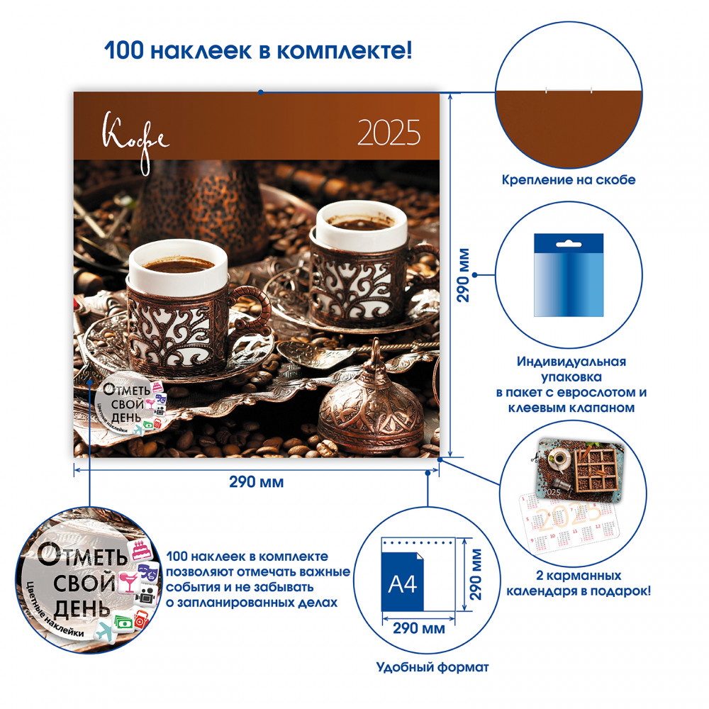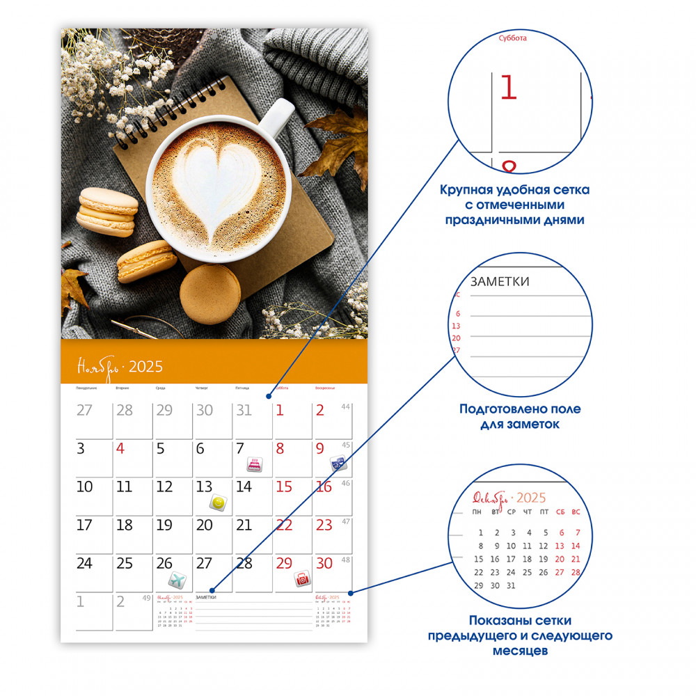 Самый популярный напиток современности после воды — это, разумеется, кофе! И это не просто напиток из смолотых кофейных зерен. Кофе — это целая философия и идеология. Множество рецептов и видов подачи, незабываемый аромат и вкус… Наш стильный календарь-органайзер подарит вам вдохновение и ауру кофейного колорита на целый год!