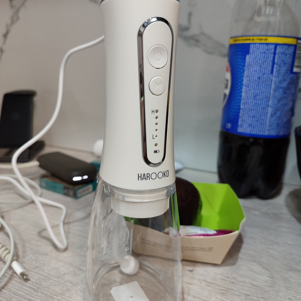 Самая полная комплектация! И адаптер и 10 насадок. Стоматолог рекомендовала именно бренд HAROOKO. Мы не ошиблись. Струя сильная, есть также режим для начинающих.