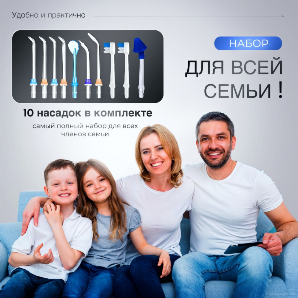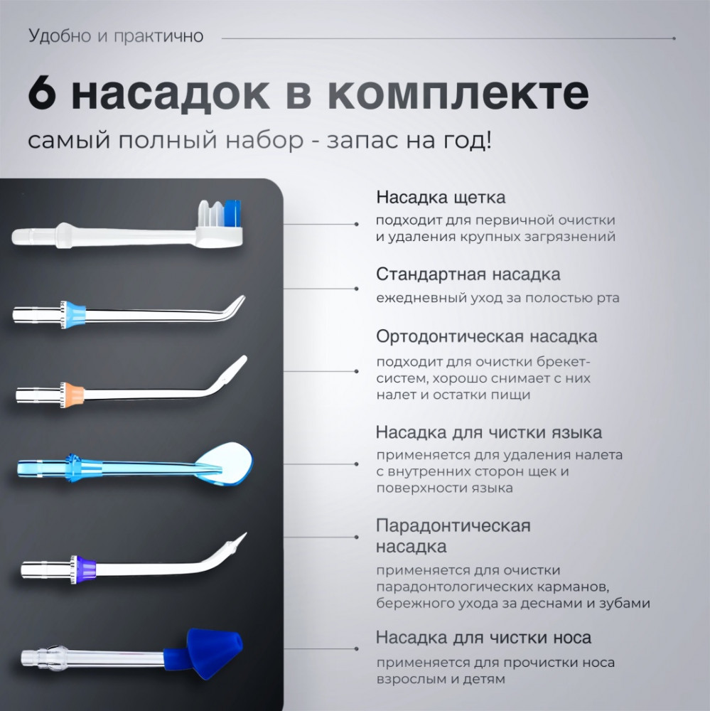 Ирригатор очень удобный в использовании, много разных насадок, очень довольны покупкой.