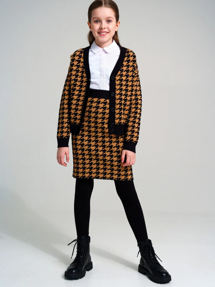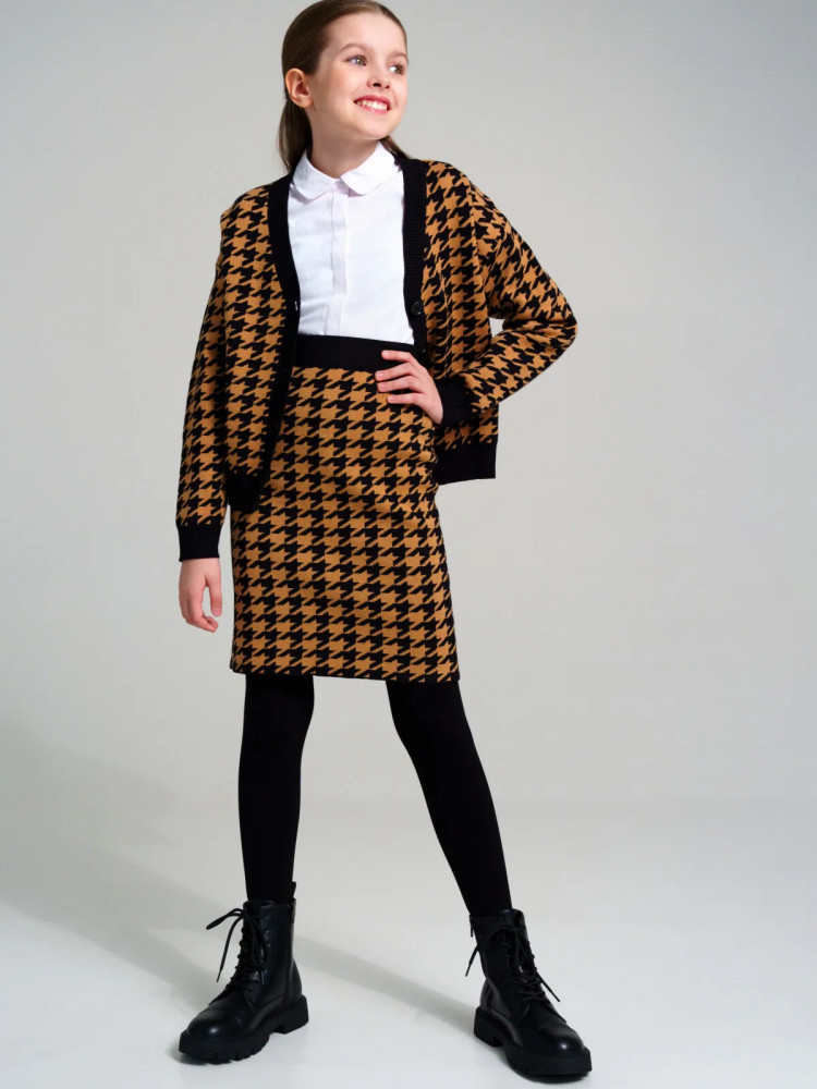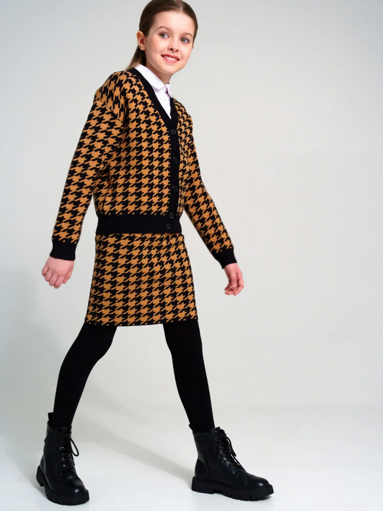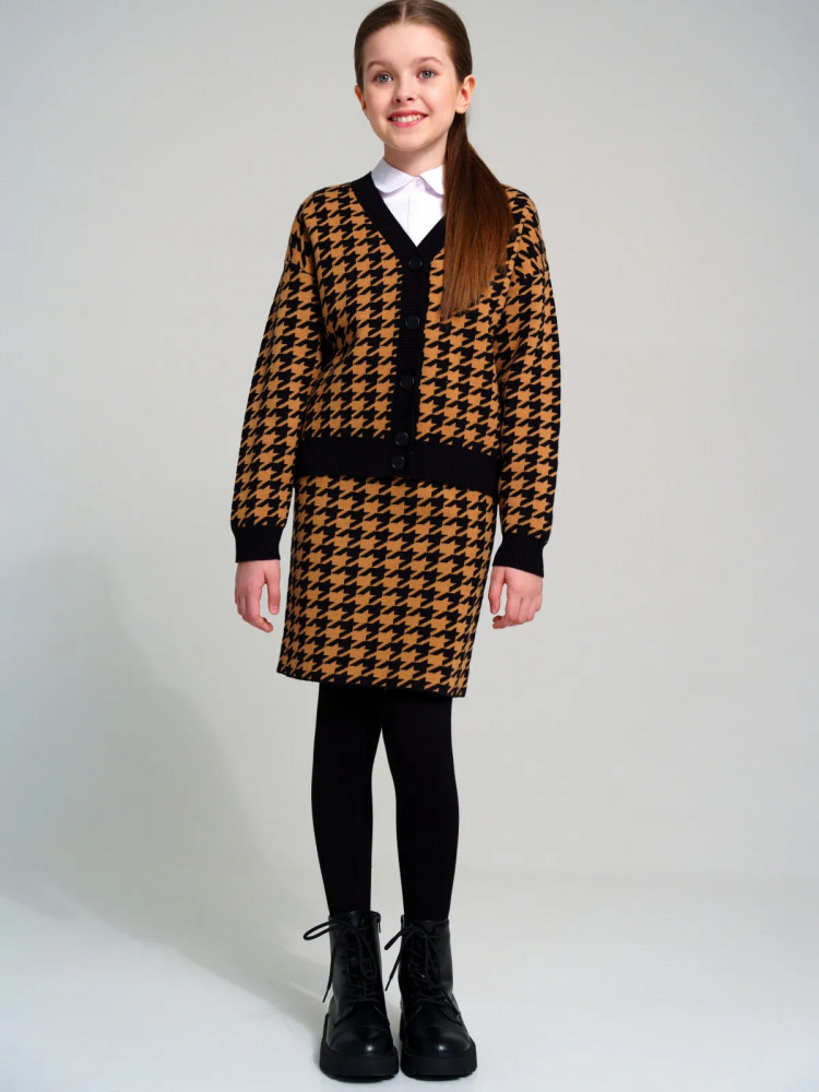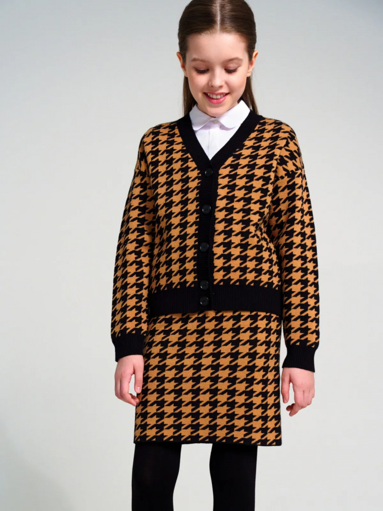 Школьный костюм для девочки-подростка с модным рисунком «гусиная лапка». Комплект для девочки подростка отлично подойдет в школу на каждый день и для торжественных мероприятий. Костюм выполнен из вязаного трикотажа с высоким содержанием вискозы, что обеспечивает максимальный комфорт для школьницы во время занятий. Кардиган, кофта оверсайз на пуговицах. Юбка прямого силуэта с резинкой по талии.