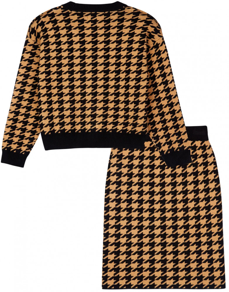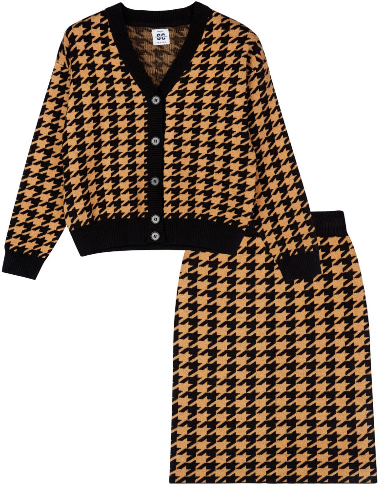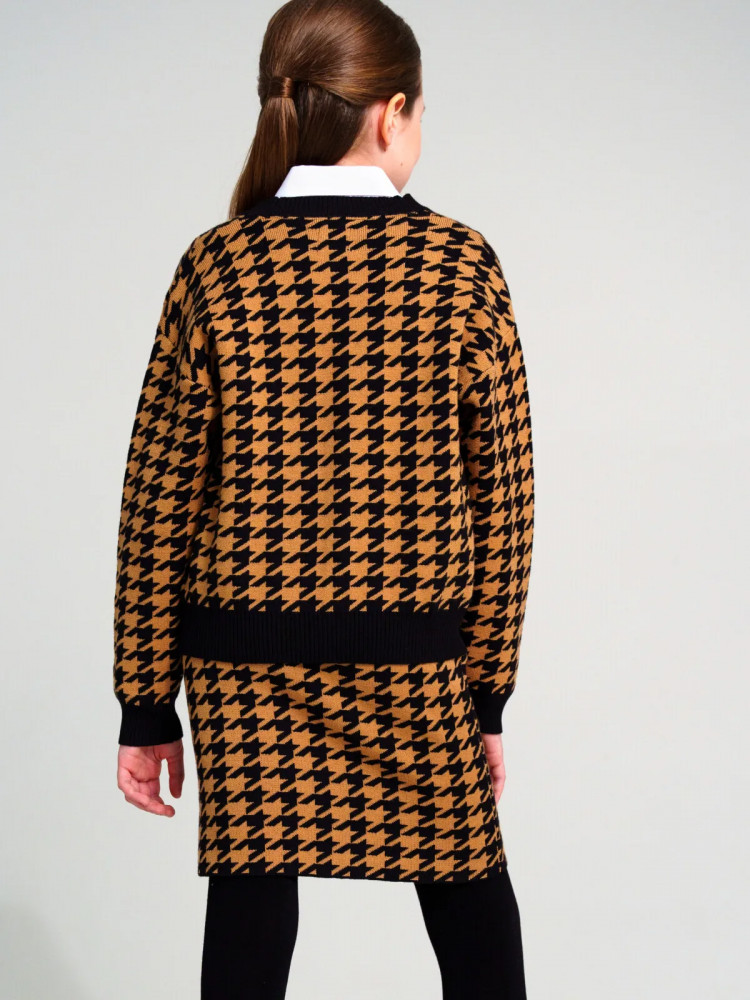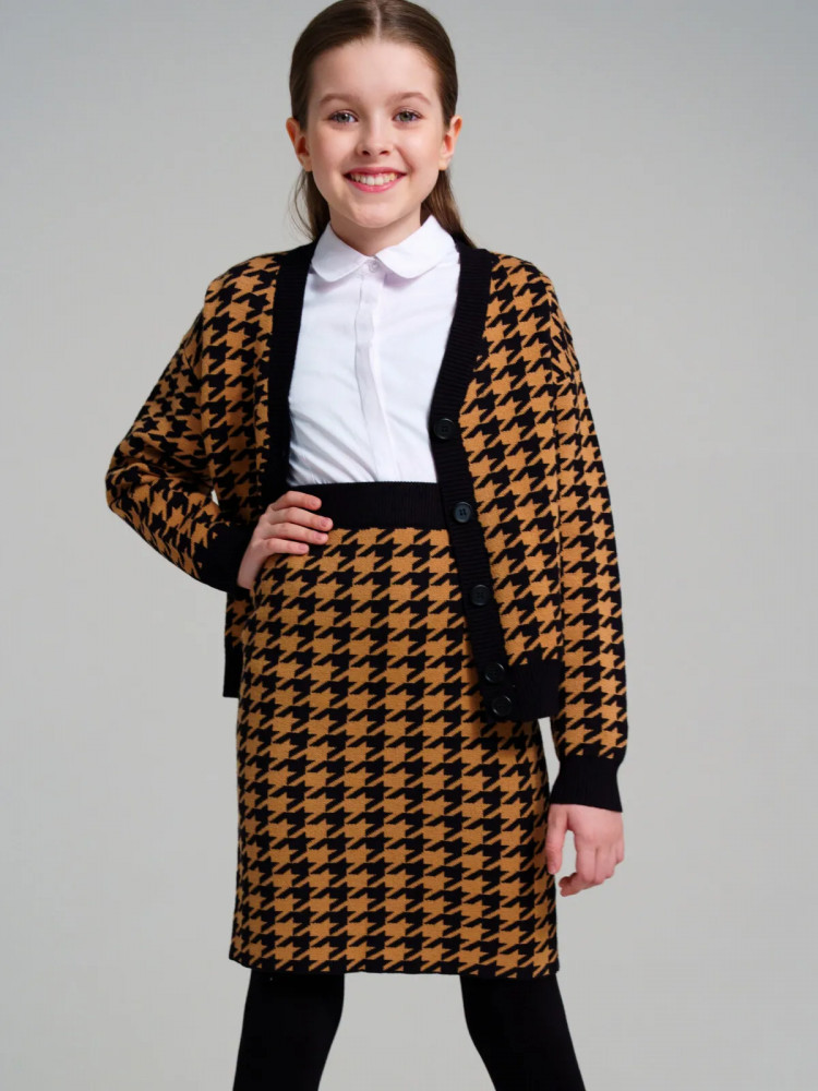 Школьный костюм для девочки-подростка с модным рисунком «гусиная лапка». Комплект для девочки подростка отлично подойдет в школу на каждый день и для торжественных мероприятий. Костюм выполнен из вязаного трикотажа с высоким содержанием вискозы, что обеспечивает максимальный комфорт для школьницы во время занятий. Кардиган, кофта оверсайз на пуговицах. Юбка прямого силуэта с резинкой по талии.