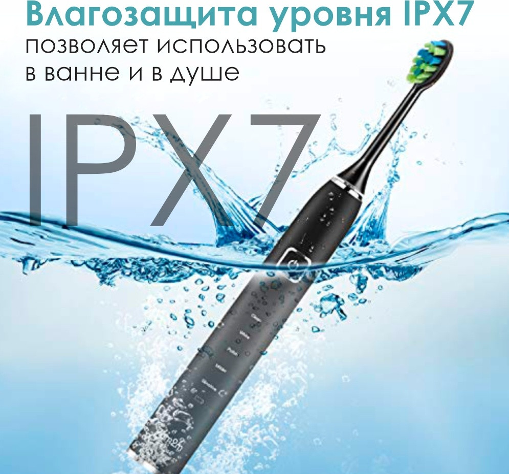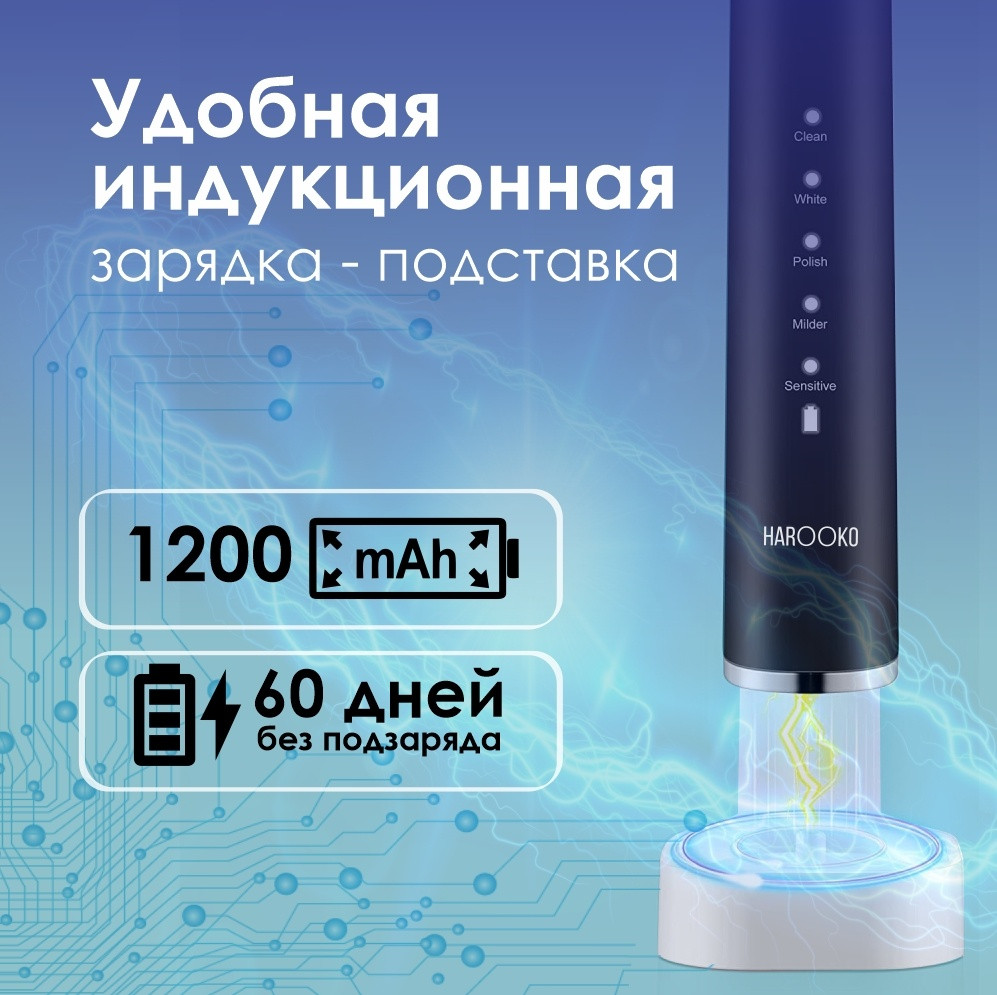 Щетка имеет 5 режимов скорости: очистка, полировка, мягкий режим, чувствительный режим, отбеливание. Водонепроницаемый, уровня IPX7, что позволяет брать собой в ванную и в душ. Умный таймер и система переключается каждый 30 секунд в новый режим, а через 2 минуты автоматический отключается от чистки. Ёмкость батареи 1200mAh, и может держаться 60 дней без зарядки, удобная индукционная зарядка-подставка.