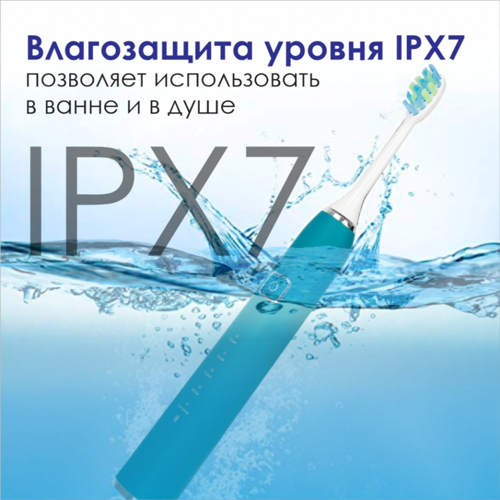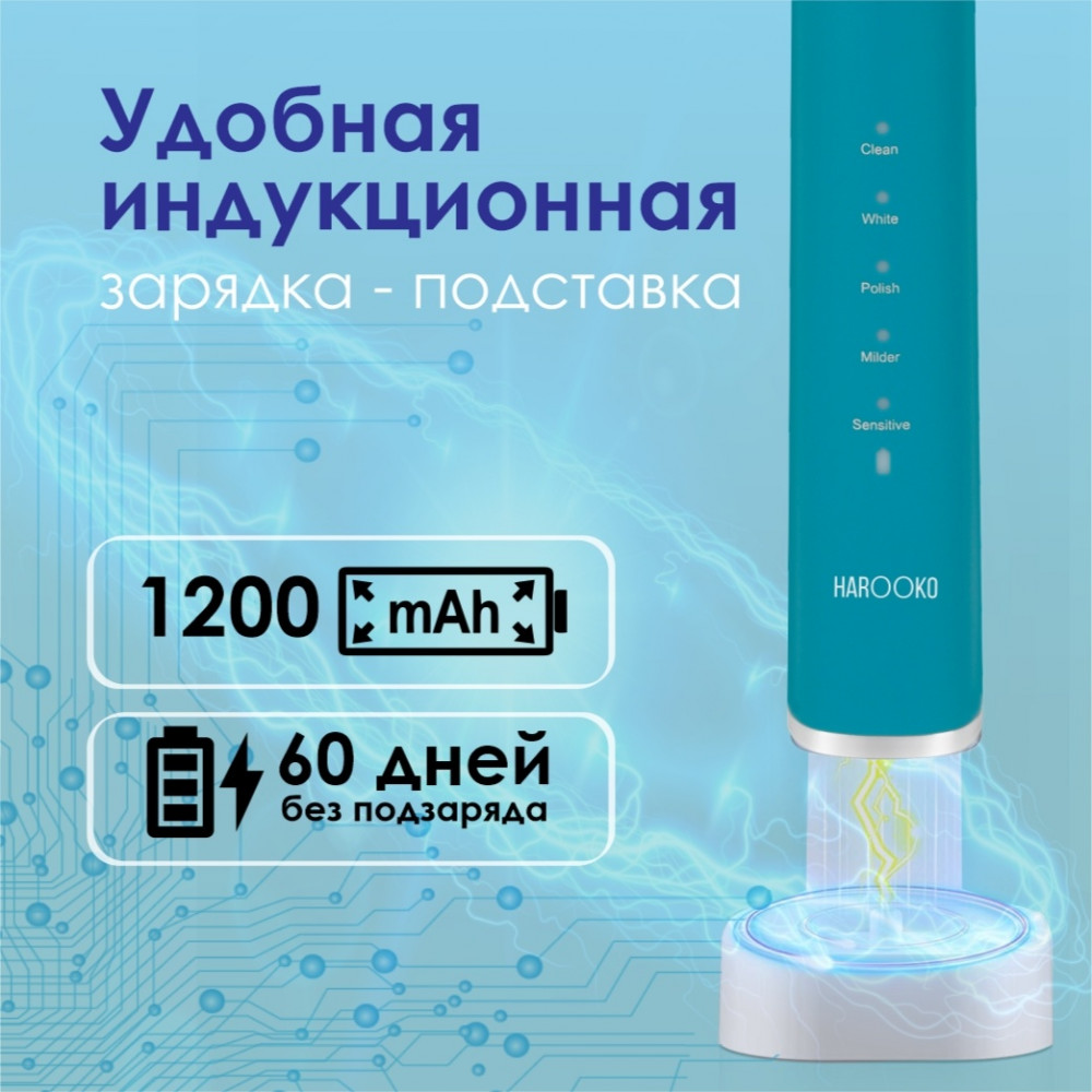 Насадка восковой плотности эффективно очищает и защищает десны. Щетка имеет 5 режимов скорости: 1.Очистка; 2. Полировка; 3. Мягкий режим; 4. Чувствительный режим; 5.Отбеливание. Водонепроницаемый, уровня IPX7, что позволяет брать собой в ванную и в душ. Умный таймер и система переключается каждый 30 секунд в новый режим, а через 2 минуты автоматический отключается от чистки. Ёмкость батареи 1200mAh, и может держаться 60 дней без зарядки, удобная индукционная зарядка-подставка.