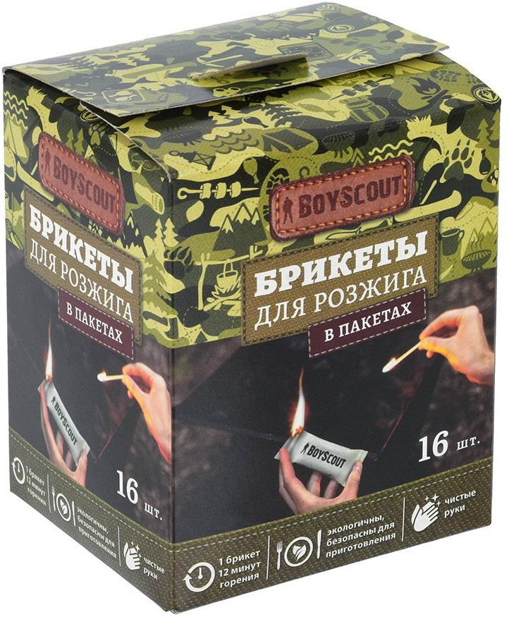 💳 Оплатить за товар можно при получении 🇰🇿 Есть бесплатная доставка по Казахстану от 1 дня 🎁 Копите бонусы с каждой покупки Брикеты для розжига в пакета Boyscout отлично подходят для быстрого разведения огня. Они изготовлены из растительных материалов, не наносят вред окружающей среде, не выделяют паров и запаха, что позволяет не менять вкус приготавливаемой пищи. Для розжига нужно просто положить пакет в дрова или угли и поджечь уголок. Нет неоходимости вскрывать пакет и доставать брикет — это предотвращает загрязнение рук. |