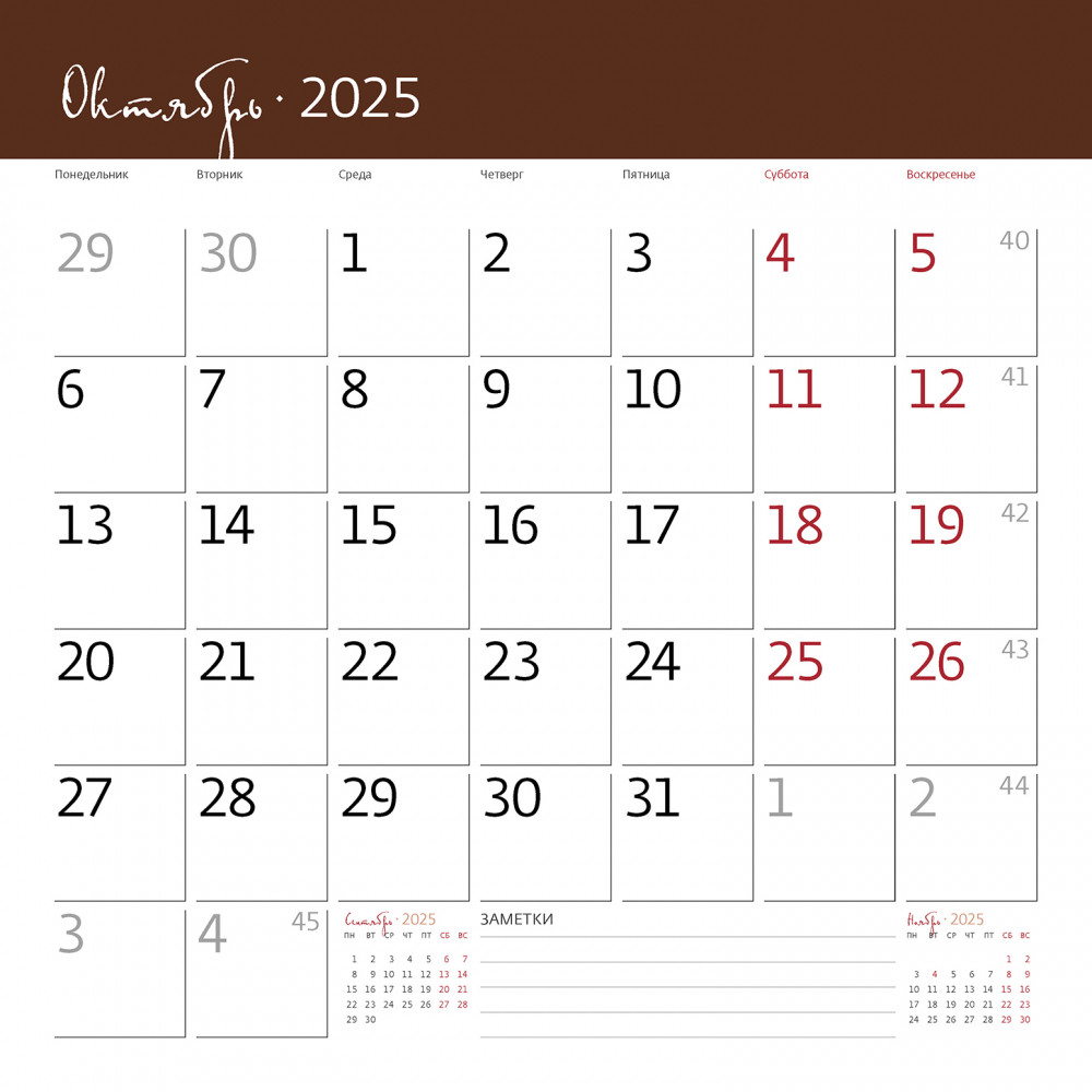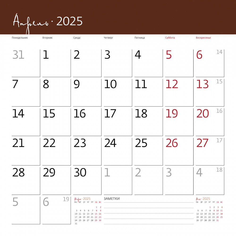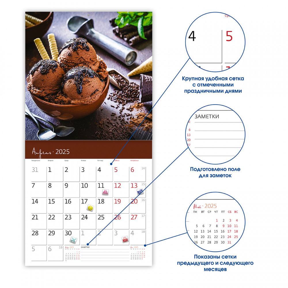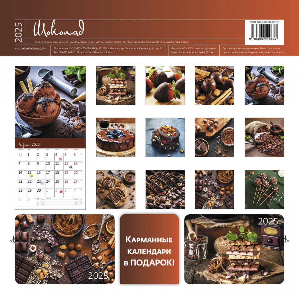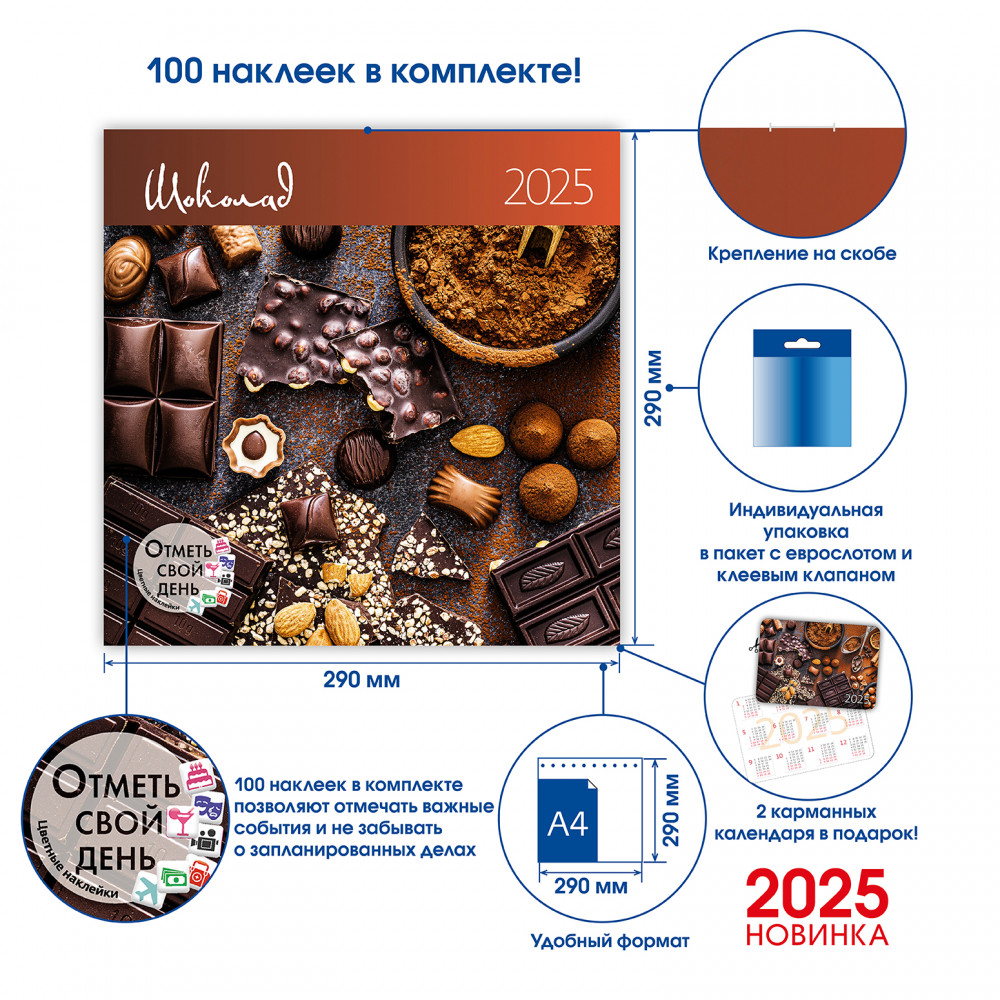 Календарь-органайзер настенный «Шоколад 2025»В данный момент этот товар отсутствует в продаже. Возможно, у нас найдется аналогичный или похожий товар здесь. Настенный календарь-органайзер на 2025 год «Шоколад». Новинка в коллекции! Позвольте себе погрузиться в сладкое искушение с нашим календарем, посвященным искусству шоколатье. Восхитительные яркие фотографии передают богатство вкусов и всевозможных текстур этого изысканного лакомства. Пусть каждый месяц напоминает о том, как прекрасно наслаждаться маленькими радостями жизни! Размер в сложенном виде 290 × 290 мм, в развернутом виде 290 × 580 мм, 14 листов, мелованная бумага 115 г/м2, крепление на скобе, отверстие для подвешивания, упакован в пакет с еврослотом и клеевым клапаном, дублирован листом картона. В календарь вложен лист со 100 яркими разноцветными наклейками на все случаи жизни! Вы больше не забудете про дни рождения, посещение театра или визит к врачу! |