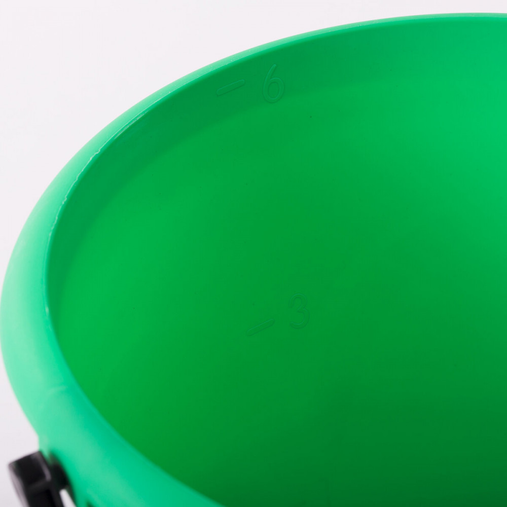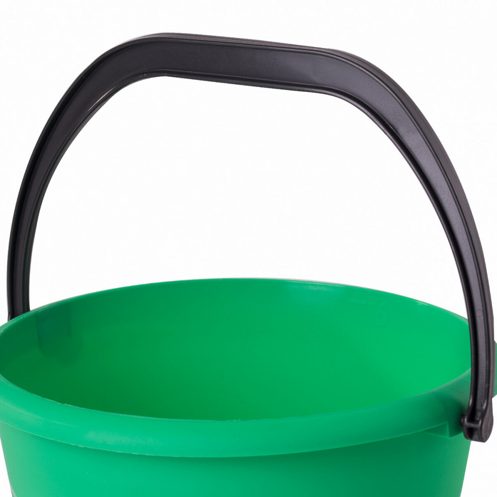 Хороший прочный пластик, пищевой, без запаха. Есть риска 6 л, примерно на 1 см ниже края. По высоте ведёрко такое же, как стандартное пятилитровое, но шире по обхвату. Цвет приятный. Ручки удобные. Пользуюсь с удовольствием! Качество полностью устраивает.