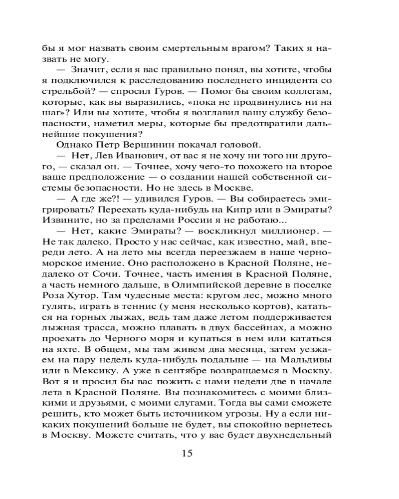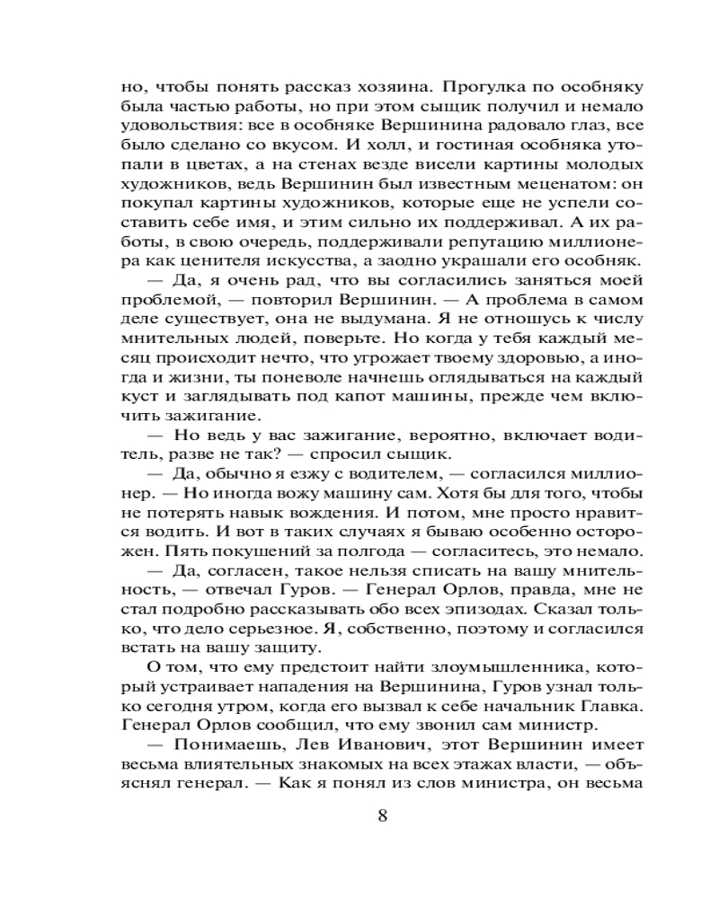 💳 Оплатить за товар можно при получении 🇰🇿 Есть бесплатная доставка по Казахстану от 1 дня 🎁 Копите бонусы с каждой покупки Серия: Черная кошка Миллионер Петр Вершинин удачлив во всем: у него прибыльный бизнес, молодая красивая жена, надежные друзья, редкая картинная галерея в собственном особняке под Сочи. Неожиданно для миллионера наступает черная полоса. В усадьбе случается пожар, гибнет часть коллекции, неизвестный стреляет в окно дома, покушаясь на жену бизнесмена. Вершинин предлагает полковнику МВД Гурову пожить у него и помочь вычислить злодея. Гуров подозревает всех, кто живет в доме: художников, бизнесмена — друга Вершинина, охранников, жену миллионера, его сына и дочь... Однако, прямых улик у сыщика нет. Все меняется, когда однажды на прогулке Гуров едва не погибает в подстроенной ловушке... |