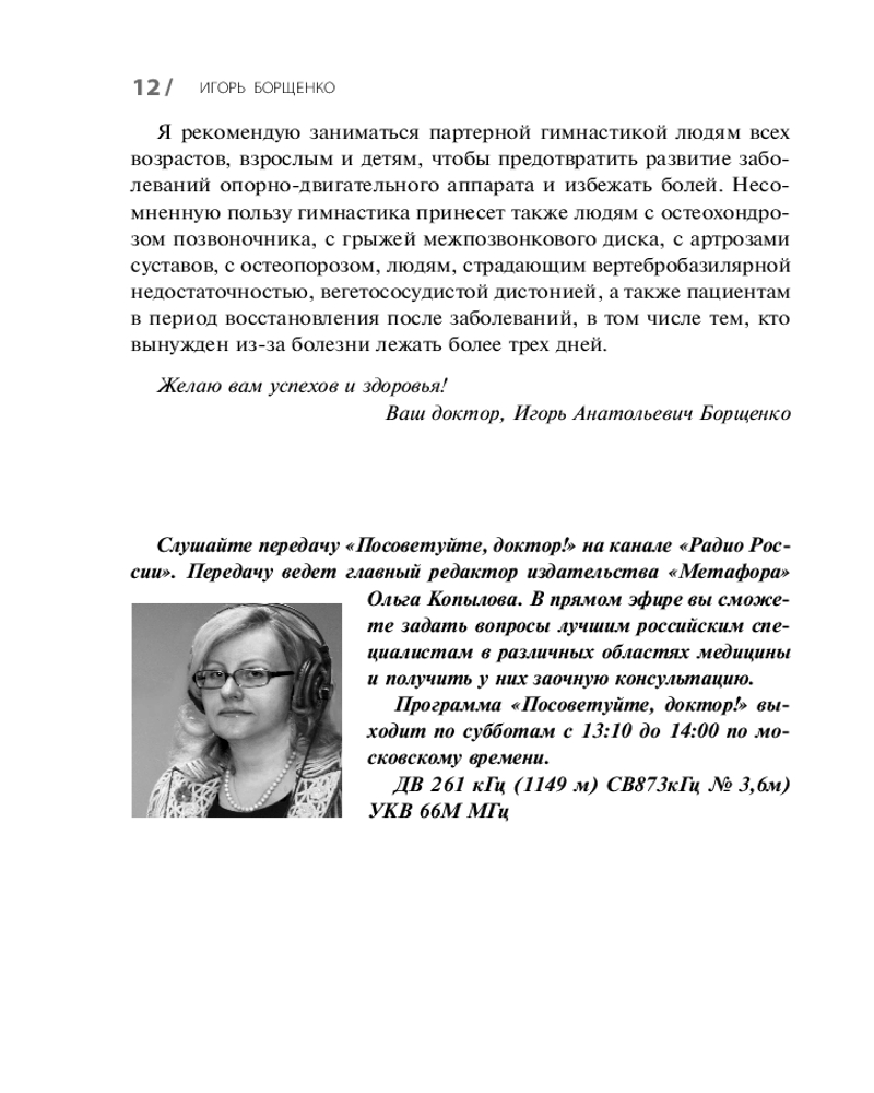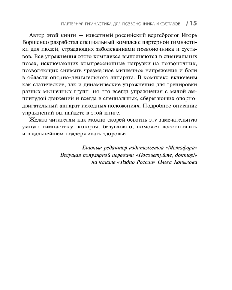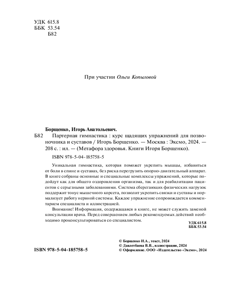 💳 Оплатить за товар можно при получении 🇰🇿 Есть бесплатная доставка по Казахстану от 1 дня 🎁 Копите бонусы с каждой покупки Серия: Метафора здоровья. Книги Игоря Борщенко Как только первобытный человек встал на ноги, он обрек себя и своих потомков на заболевания позвоночника и суставов. В вертикальном положении мы потеряли биомеханические преимущества равномерного распределения тяжести тела на позвонки и суставы. Боли в пояснице, смещенные межпозвонковые диски, изношенные коленные и тазобедренные суставы — вот та цена, которую приходится платить человеку за прямохождение. Максимально разгрузить опорно-двигательный аппарат и при этом сформировать мощный мышечный корсет для поддержания позвоночника в вертикальном положении поможет партерная гимнастика. Сберегающий, щадящий характер партерных тренировок позволяет с успехом применять эту методику как здоровым людям, так и больным. Заболевания, при которых поможет партерная гимнастика: остеохондроз, грыжа межпозвоночного диска, артроз, остеопороз, вегето-сосудистая дистония. |