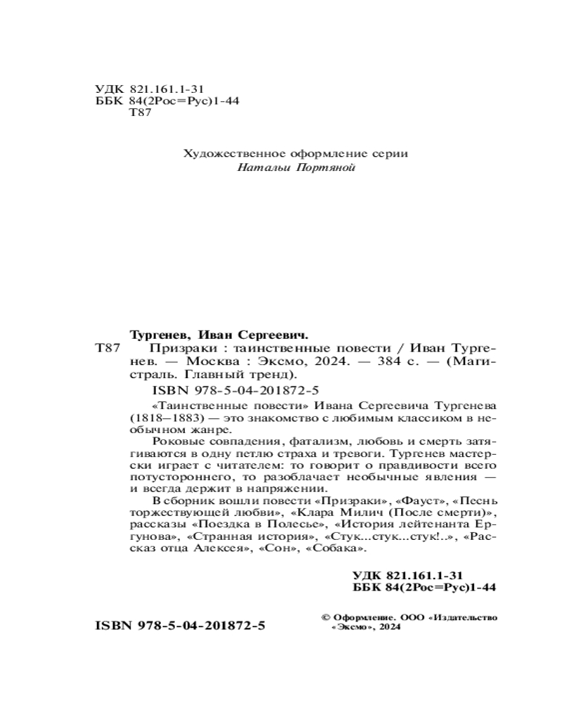 💳 Оплатить за товар можно при получении 🇰🇿 Есть бесплатная доставка по Казахстану от 1 дня 🎁 Копите бонусы с каждой покупки Серия: Магистраль. Главный тренд «Таинственные повести» Ивана Сергеевича Тургенева (1818–1883) — это знакомство с любимым классиком в необычном жанре. Роковые совпадения, фатализм, любовь и смерть затягиваются в одну петлю страха и тревоги. Тургенев мастерски играет с читателем: то говорит о правдивости всего потустороннего, то разоблачает необычные явления, и всегда держит в напряжении. В сборник вошли повести «Призраки», «Фауст», «Песнь торжествующей любви», «Клара Милич (После смерти)», рассказы «Поездка в Полесье», «История лейтенанта Ергунова», «Странная история», «Стук...стук...стук!..», «Рассказ отца Алексея», «Сон», «Собака». |