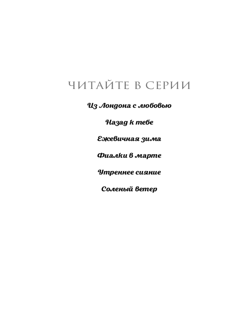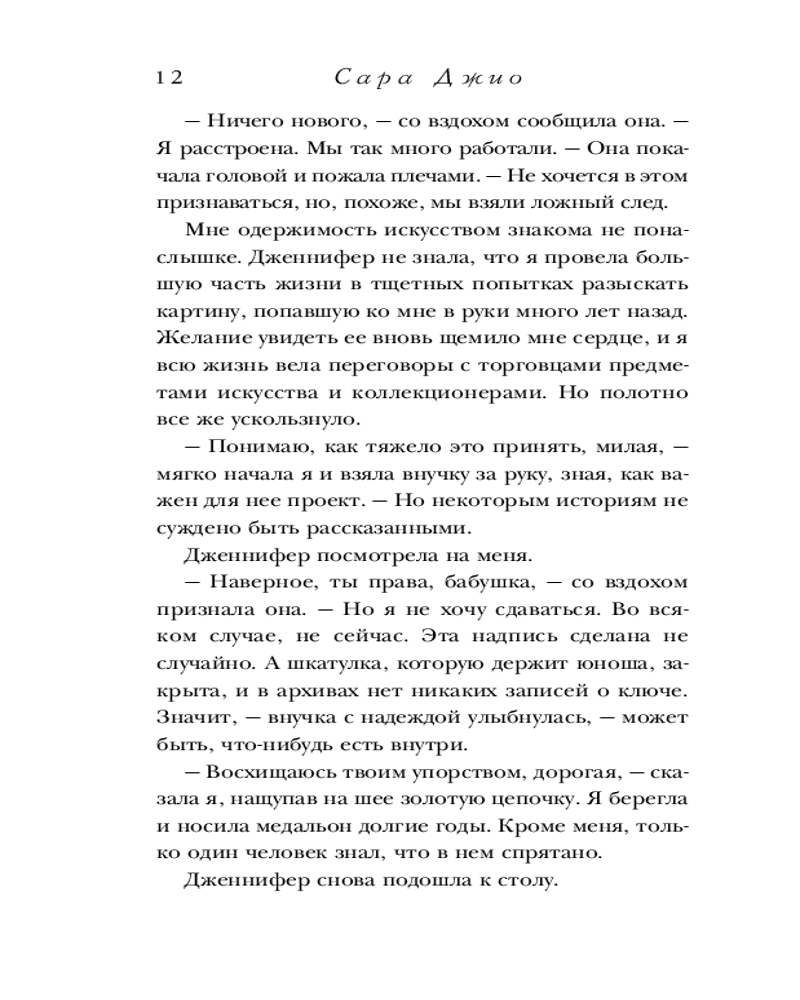 Сара Джио повествует о необычных людских судьбах, о затерянных в прошлом семейных тайнах и, конечно, о любви. Ее многогранные, полные психологизма истории пленяют души, смягчают сердца, наполняют жизнь теплом. Дебютный роман Сары Джио "Фиалки в марте" получил статус бестселлера по версии "USAToday" и был объявлен... |