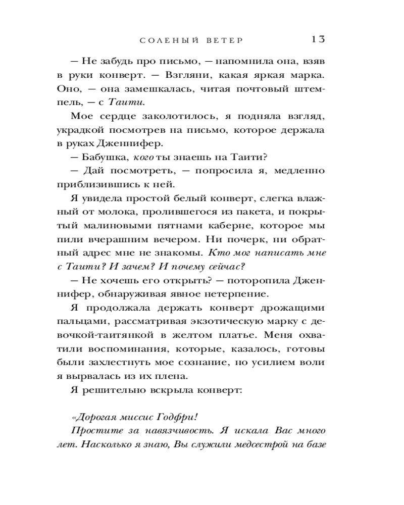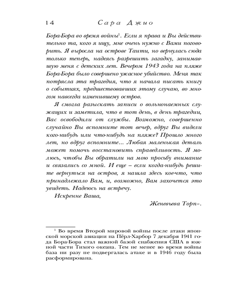 В данный момент этот товар отсутствует в продаже. Возможно, у нас найдется аналогичный или похожий товар здесь. Серия: Novel. Зарубежный романтический бестселлер. Романы Сары Джио Остров Бора-Бора, 1943 год. Анна Кэллоуэй решает сбежать от наскучившей тепличной жизни и отправляется в качестве военной медсестры на остров в Тихом океане. Там Анна знакомится с обаятельным солдатом Уэстри Грином, и их отношения, подобно цветам гибискуса, расцветают ярким огненным пламенем. Неподалеку от дикого пляжа они находят старую хижину, в которой когда-то жил известный художник. Кажется, это волшебное время для двоих никогда не закончится, но герои становятся свидетелями жуткого происшествия... Сиэтл, наши дни. Женевьева Торп отправляет на имя Анны Кэллоуэй письмо, в котором говорится об убийстве, произошедшем много лет назад на Бора-Бора. Женевьева намерена пролить свет на случившееся, но для начала ей нужно поделиться с Анной важной информацией... |