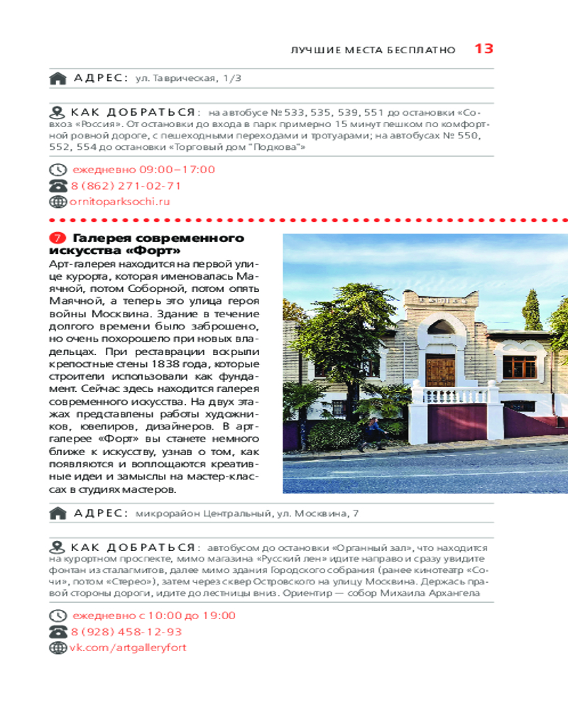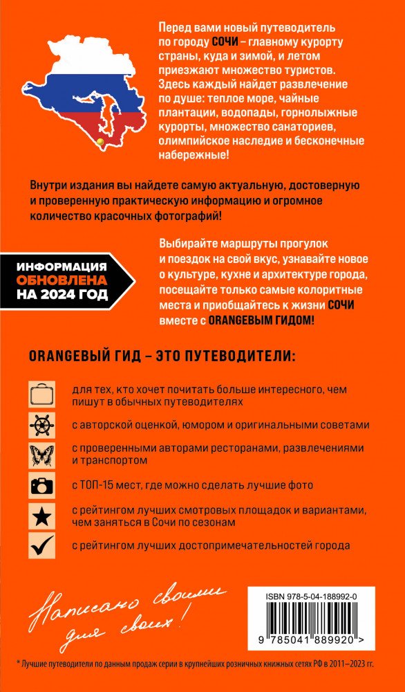 💳 Оплатить за товар можно при получении 🇰🇿 Есть бесплатная доставка по Казахстану от 1 дня 🎁 Копите бонусы с каждой покупки Серия: Оранжевый гид (обложка) Теплое море, горнолыжные курорты, множество санаториев и бесконечные набережные — все это про Сочи! Отправляйтесь в незабываемое путешествие по главному курорту страны вместе с нашим «Оранжевым гидом»! В нем содержится актуальная и полезная информация о Сочи, различные маршруты на любой вкус, подсказки, что делать, если идет дождь, или где искать лучшие смотровые площадки, а также множество полезных советов от автора Ирины Сущевой, которая является местным гидом и блогером. Сориентироваться на местности помогут удобные карты, расположенные на страницах путеводителя. Вся информация актуальна на 2024 год. |