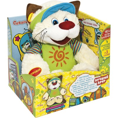 На лапах кнопки с игрой - 4 варианта, в положении лежа начинает рассказывать сказки. Учит ребенка мурлыкать, причесывать шерстку. Батарейки в комплекте, очень нам понравился этот кот!
