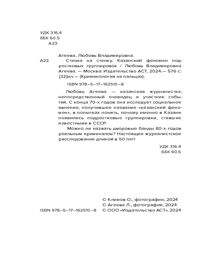 💳 Оплатить за товар можно при получении 🇰🇿 Есть бесплатная доставка по Казахстану от 1 дня 🎁 Копите бонусы с каждой покупки Серия: Криминология на пальцах Любовь Агеева — казанская журналистка, непосредственный очевидец и участник событий. С конца 70-х годов она исследует социальное явление, получившее название «казанский феномен», в попытках понять, почему именно в Казани появились подростковые группировки, ставшие известными в СССР. Можно ли назвать дворовые банды 80-х годов реальным криминалом? Настоящее журналистское расследование длиной в 50 лет! |