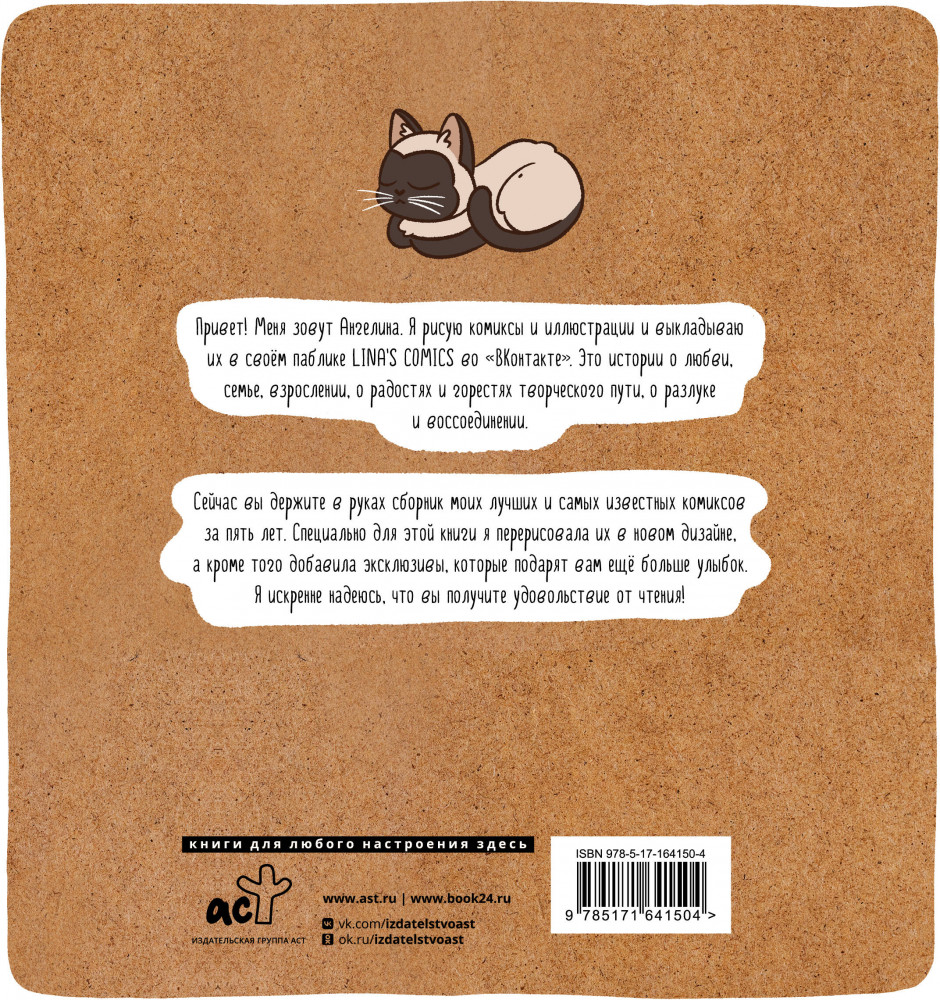 💳 Оплатить за товар можно при получении 🇰🇿 Есть бесплатная доставка по Казахстану 🎁 Копите бонусы с каждой покупки Серия: Мейнстрим. Наши комиксы Привет! Меня зовут Ангелина. Я рисую комиксы и иллюстрации и выкладываю их в своём паблике Lina’s Comics во «ВКонтакте». Это истории о любви, семье, взрослении, о радостях и горестях творческого пути, о разлуке и воссоединении. Сейчас вы держите в руках сборник моих лучших и самых известных комиксов за пять лет. Специально для этой книги я перерисовала их в новом дизайне, а кроме того добавила эксклюзивы, которые подарят вам ещё больше улыбок. Я искренне надеюсь, что вы получите удовольствие от чтения! |