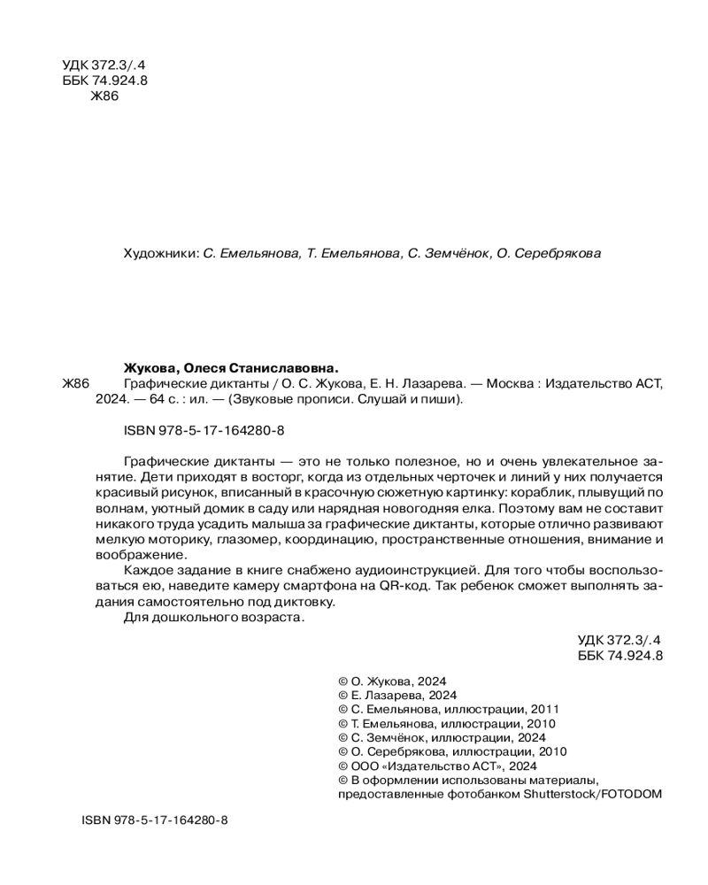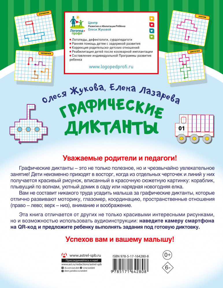 💳 Оплатить за товар можно при получении 🇰🇿 Есть бесплатная доставка по Казахстану от 1 дня 🎁 Копите бонусы с каждой покупки Серия: Звуковые прописи. Слушай и пиши Графические диктанты — это не только полезное, но и очень увлекательное занятие. Дети приходят в восторг, когда из отдельных черточек и линий у них получается красивый рисунок, вписанный в красочную сюжетную картинку: кораблик, плывущий по волнам, уютный домик в саду или нарядная новогодняя елка. Поэтому вам не составит никакого труда усадить малыша за графические диктанты, которые отлично развивают мелкую моторику, глазомер, координацию, пространственные отношения, внимание и воображение. Каждое задание в книге снабжено аудиоинструкцией. Для того чтобы воспользоваться ею, наведите камеру смартфона на QR-код. Так ребенок сможет выполнять задания самостоятельно под диктовку. Для дошкольного возраста. |