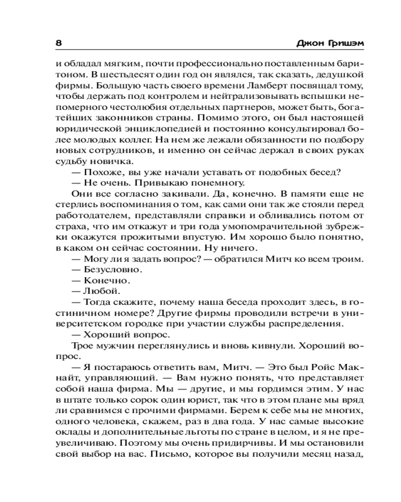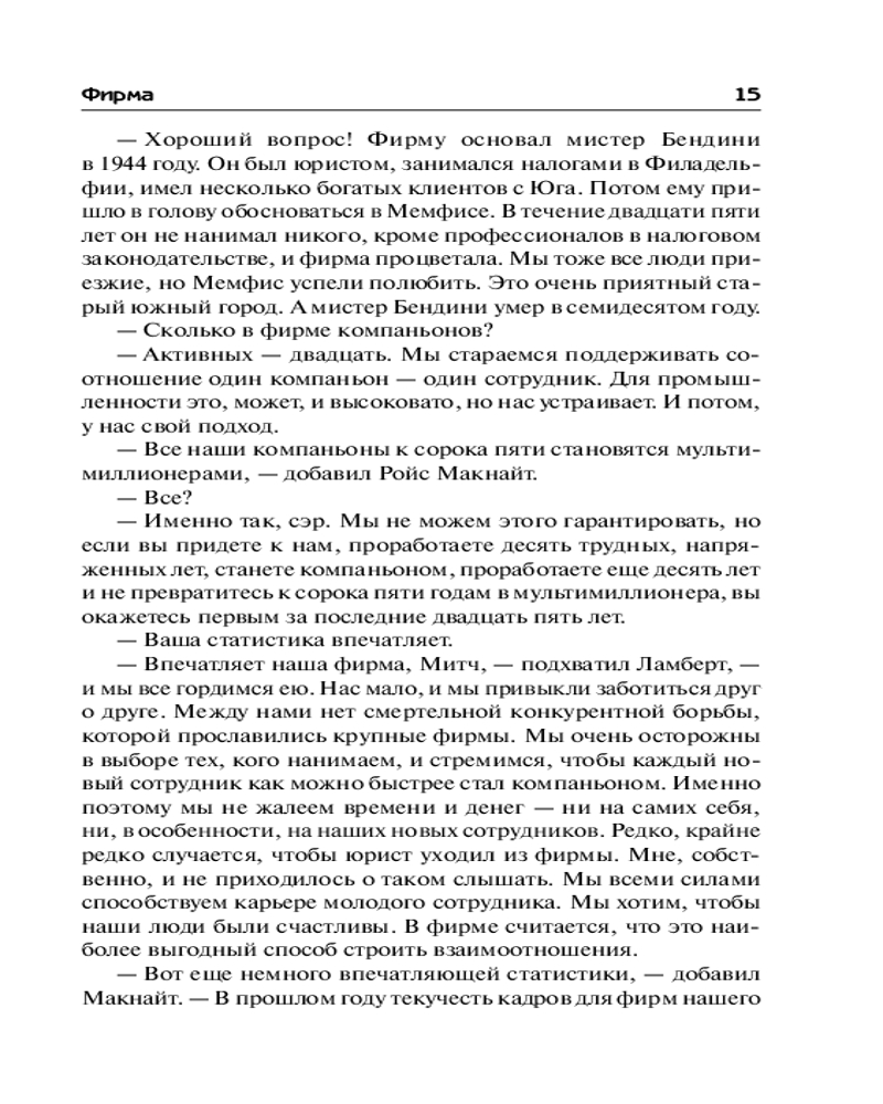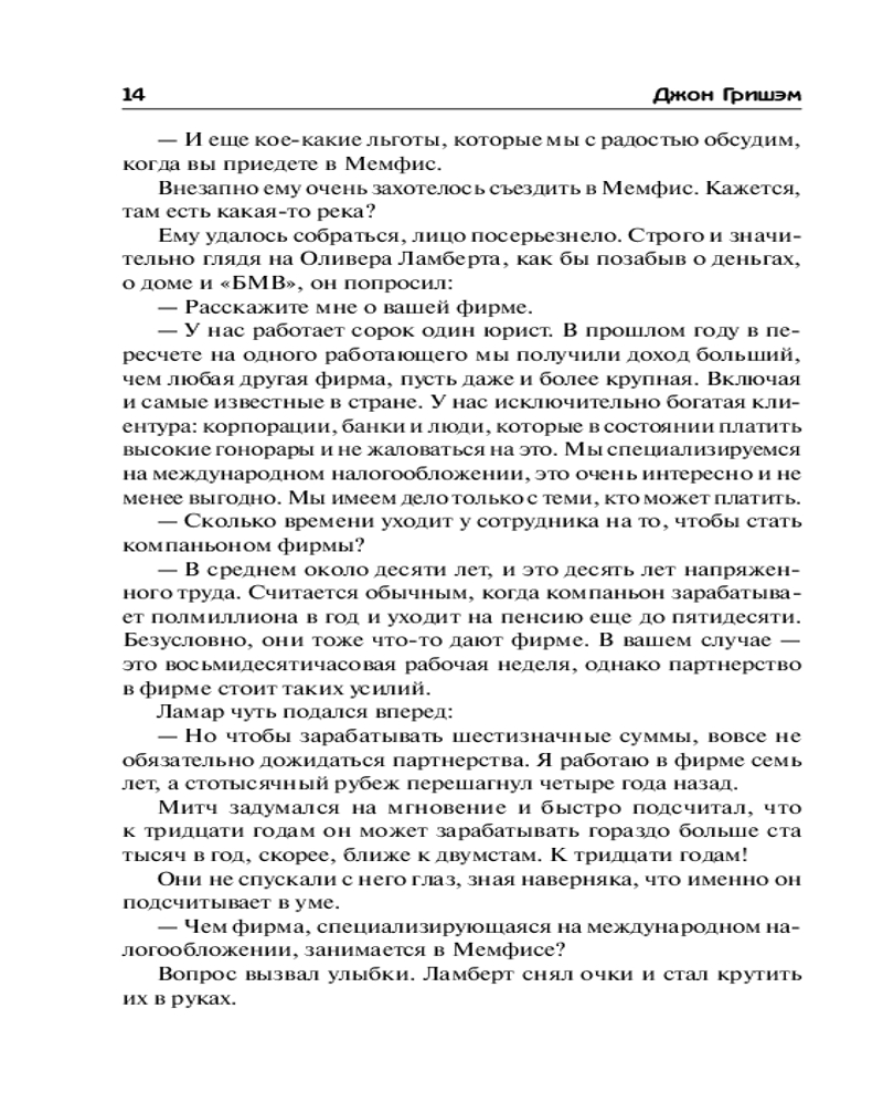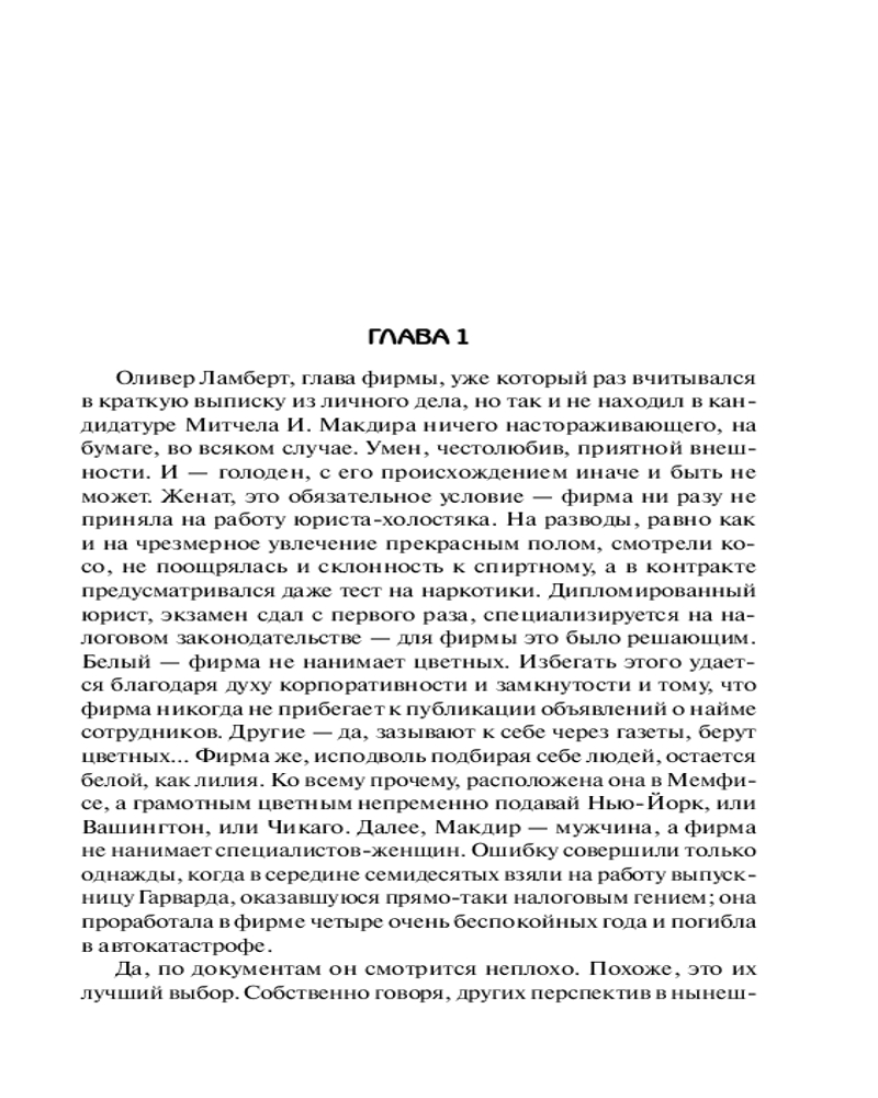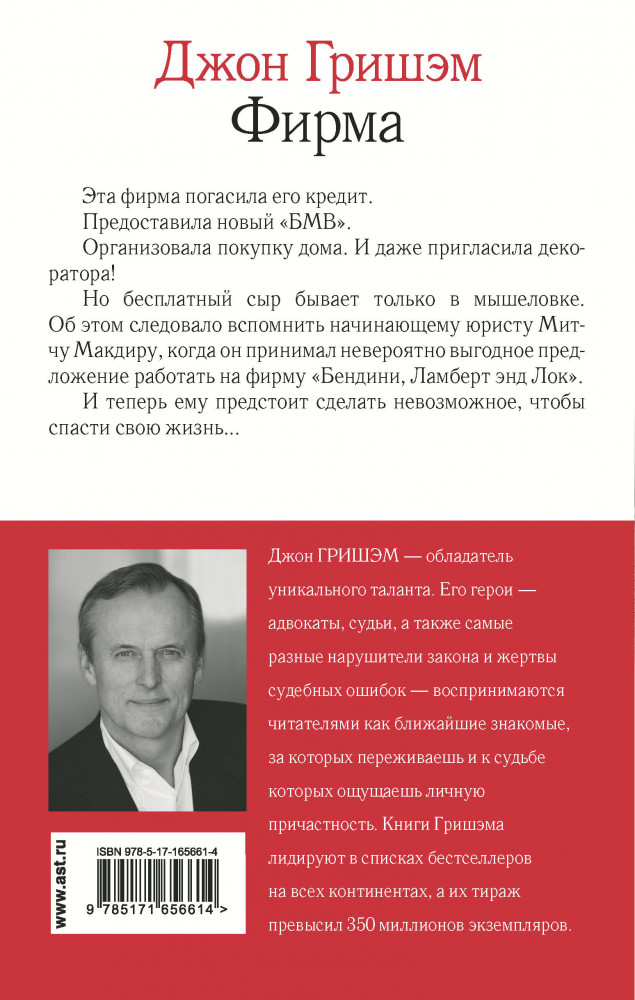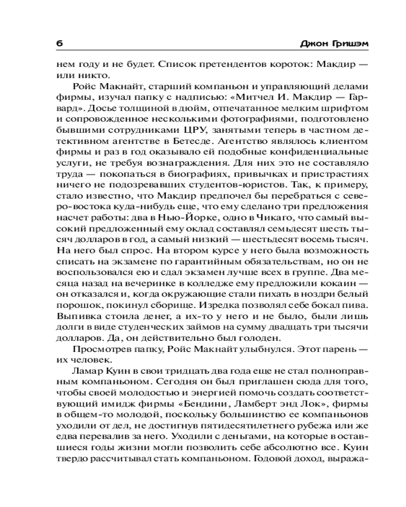 захватывающий сюжет хорошая история В данный момент этот товар отсутствует в продаже. Возможно, у нас найдется аналогичный или похожий товар здесь. Серия: Гришэм: лучшее Эта фирма погасила его кредит. Предоставила новый «БМВ». Организовала покупку дома. И даже пригласила декоратора! Но бесплатный сыр бывает только в мышеловке. Об этом следовало вспомнить начинающему юристу Митчу Макдиру, когда он принимал невероятно выгодное предложение работать на фирму «Бендини, Ламберт энд Лок». И теперь ему предстоит сделать невозможное, чтобы спасти свою жизнь... |