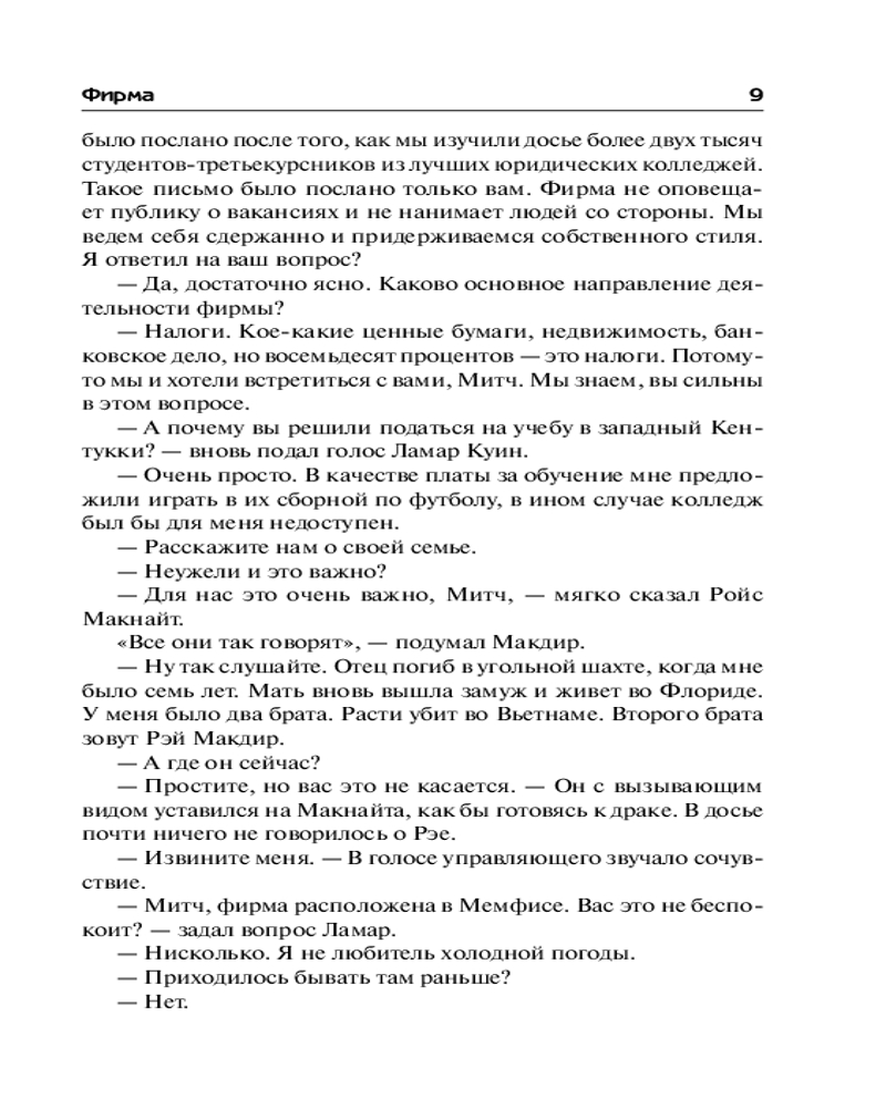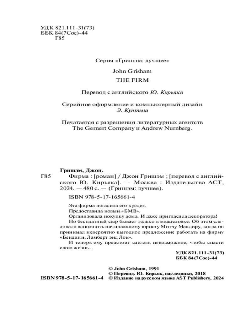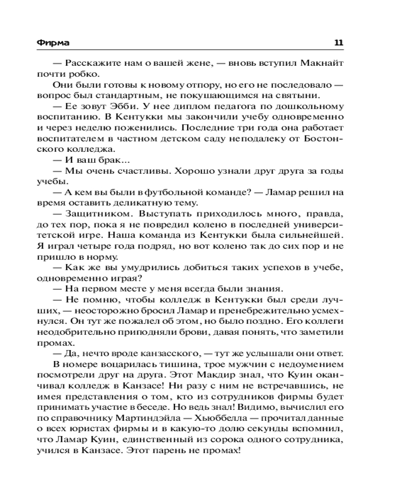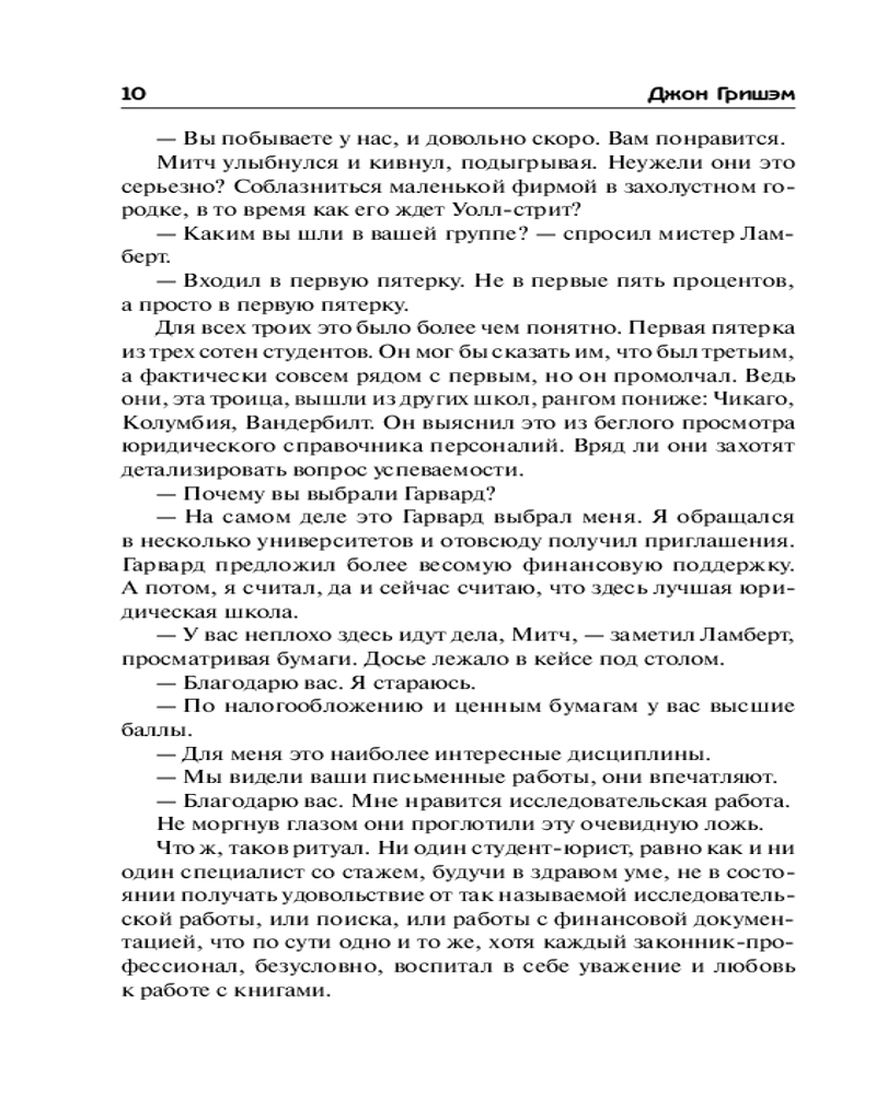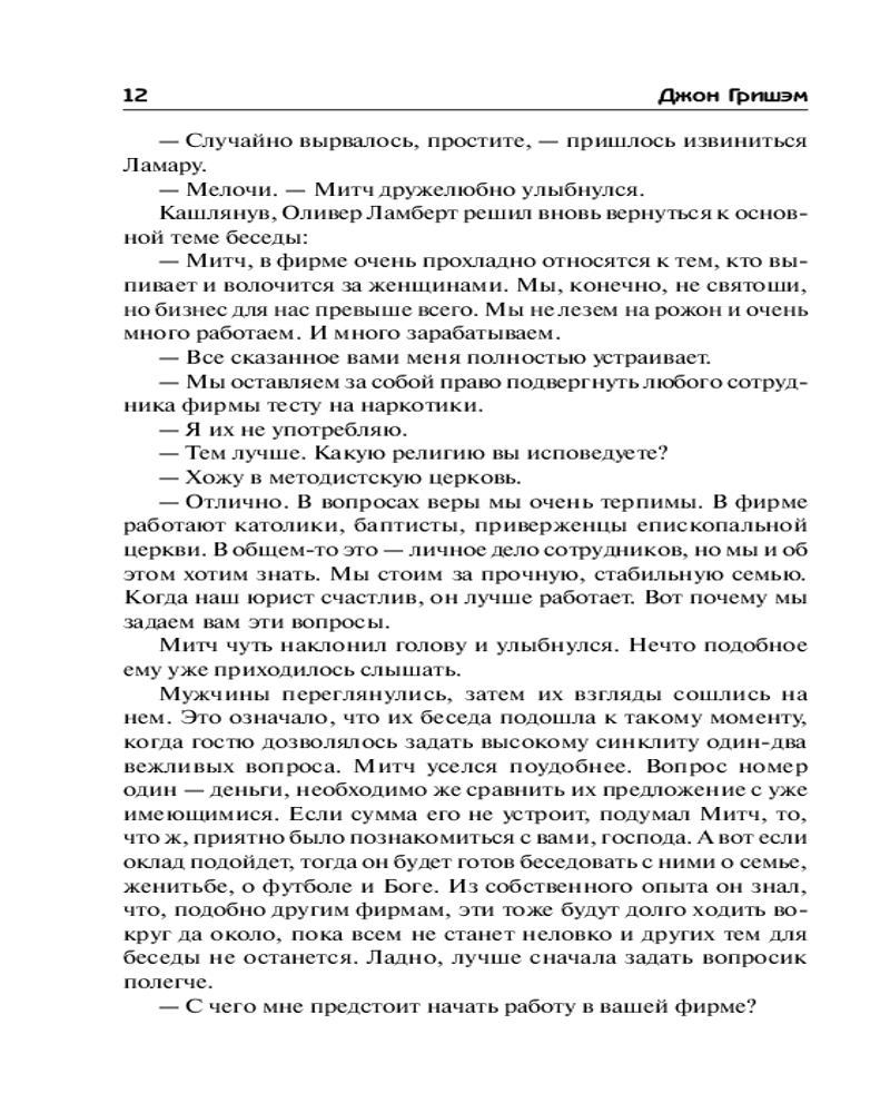 захватывающий сюжет хорошая история В данный момент этот товар отсутствует в продаже. Возможно, у нас найдется аналогичный или похожий товар здесь. Серия: Гришэм: лучшее Эта фирма погасила его кредит. Предоставила новый «БМВ». Организовала покупку дома. И даже пригласила декоратора! Но бесплатный сыр бывает только в мышеловке. Об этом следовало вспомнить начинающему юристу Митчу Макдиру, когда он принимал невероятно выгодное предложение работать на фирму «Бендини, Ламберт энд Лок». И теперь ему предстоит сделать невозможное, чтобы спасти свою жизнь... |