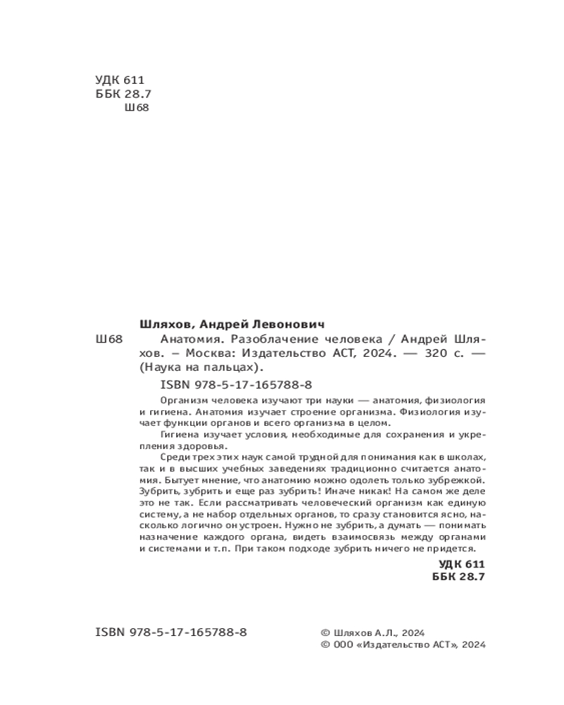 💳 Оплатить за товар можно при получении 🇰🇿 Есть бесплатная доставка по Казахстану от 1 дня 🎁 Копите бонусы с каждой покупки Серия: Наука на пальцах Организм человека изучают три науки — анатомия, физиология и гигиена. Анатомия изучает строение организма. Физиология изучает функции органов и всего организма в целом. Гигиена изучает условия, необходимые для сохранения и укрепления здоровья. Среди трех этих наук самой трудной для понимания как в школах, так и в высших учебных заведениях традиционно считается анатомия. Бытует мнение, что анатомию можно одолеть только зубрежкой. Зубрить, зубрить и еще раз зубрить! Иначе никак! На самом же деле это не так. Если рассматривать человеческий организм как единую систему, а не набор отдельных органов, то сразу становится ясно, на сколько логично он устроен. Нужно не зубрить, а думать — понимать назначение каждого органа, видеть взаимосвязь между органами и системами и т.п. При таком подходе зубрить ничего не придется. |