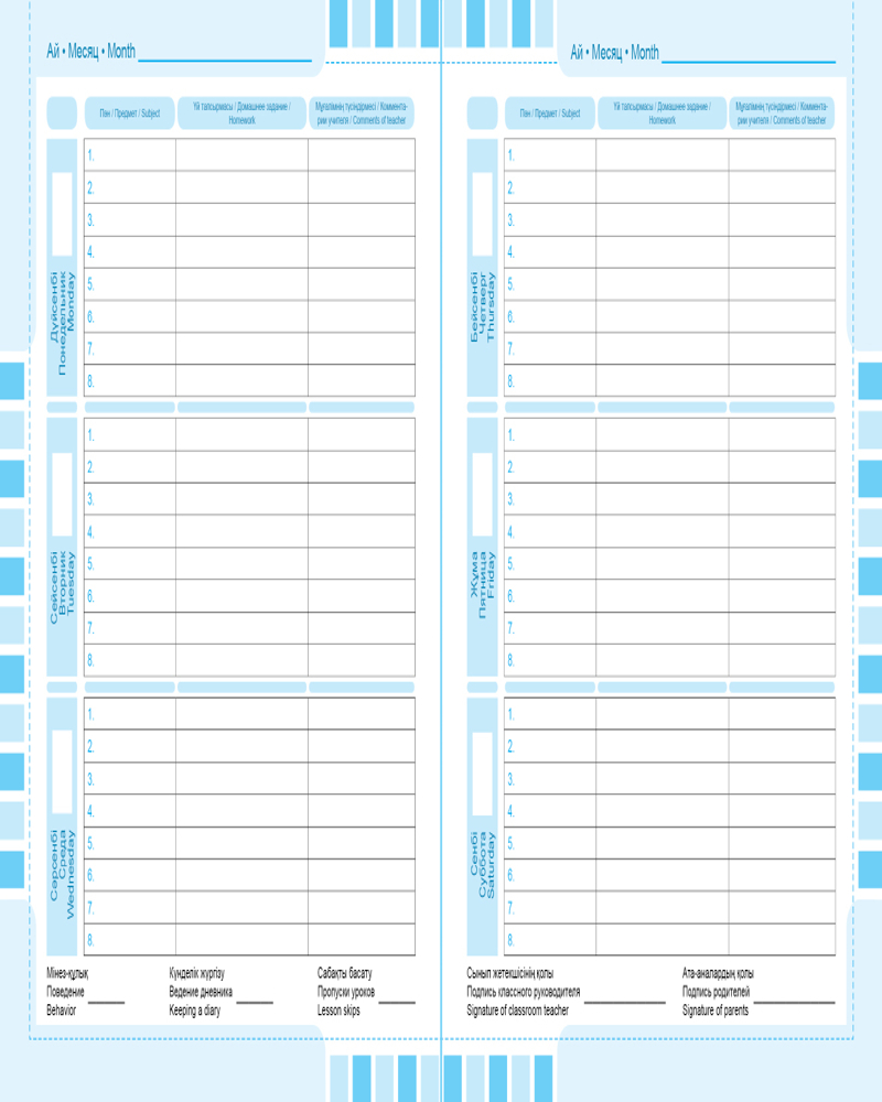 Дневник школьный96 листов многоязычность плотная обложка расписание уроков учёт прочитанного В данный момент этот товар отсутствует в продаже. Возможно, у нас найдется аналогичный или похожий товар здесь. Дневник школьный с шестидневной учебной неделей, 3-х язычный (казахский, русский, английский). |