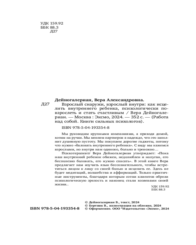 💳 Оплатить за товар можно при получении 🇰🇿 Есть бесплатная доставка по Казахстану от 1 дня 🎁 Копите бонусы с каждой покупки Серия: Работа над собой. Книги сильных психологов Мы руководим крупными компаниями, а приходя домой хотим на ручки. Мы меняем партнеров в надежде, что это заполнит душевную пустоту. Мы покупаем дорогие гаджеты, потому что нужно «баловать внутреннего ребенка». С виду мы кажемся взрослыми, но внутри нам одиноко, больно и тревожно... Психотерапевт Вера Дейногалериан утверждает: «Пока наш внутренний ребенок обижен, недолюблен и напуган, его бесполезно баловать, — его нужно спасать». В этой книге Вера предлагает нам изучить язык бессознательного, чтобы встретиться лицом к лицу со своей болью и исцелить ее. Здесь не будет медитаций, волшебства и аффирмаций. Только практичные инструменты, благодаря которым сотни клиентов обрели психологическую зрелость и наконец стали хозяевами своей жизни. |
