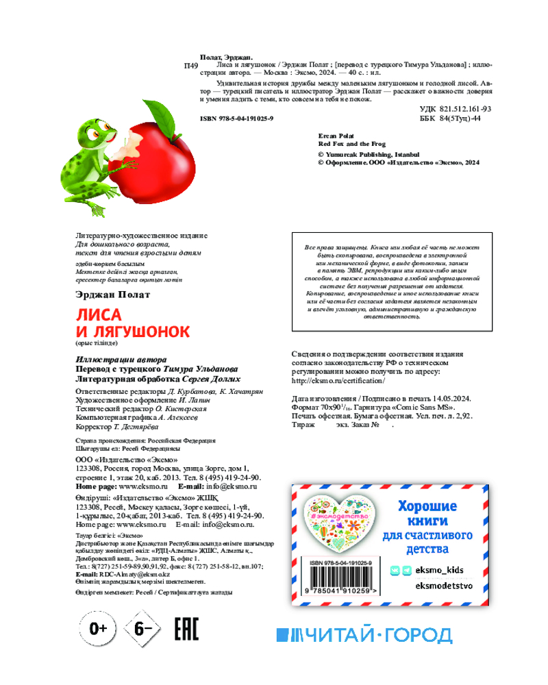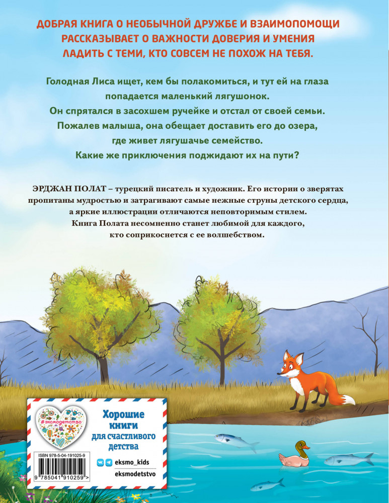 💳 Оплатить за товар можно при получении 🇰🇿 Есть бесплатная доставка по Казахстану от 1 дня 🎁 Копите бонусы с каждой покупки Серия: Сказки в картинках для малышей Очаровательная сказка, в которой даже самые непохожие зверята могут стать настоящими друзьями! Замечательная книжка с картинками для детей от 4-х лет рассказывает о важности доверия и умения ладить с теми, кто от тебя отличается. Голодная Лиса ищет, чем бы полакомиться, и тут ей на глаза попадается маленький Лягушонок. Он спрятался в засохшем ручейке и отстал от своей семьи. Пожалев малыша, она обещает доставить его до озера, где живёт лягушачье семейство. Удивительные приключения и забота друг о друге помогут героям сблизиться и стать настоящими друзьями. |