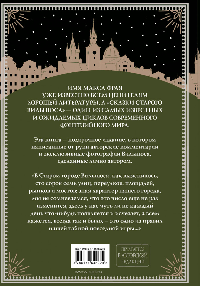 💳 Оплатить за товар можно при получении 🇰🇿 Есть бесплатная доставка по Казахстану от 1 дня 🎁 Копите бонусы с каждой покупки Серия: Макс Фрай: подарочное издание Имя Макса Фрая уже известно всем ценителям хорошей литературы, а «Сказки старого Вильнюса» — один из самых известных и ожидаемых циклов современного фэнтезийного мира. Эта книга — подарочное издание, в котором написанные от руки авторские комментарии и эксклюзивные фотографии Вильнюса, сделаны лично автором. |