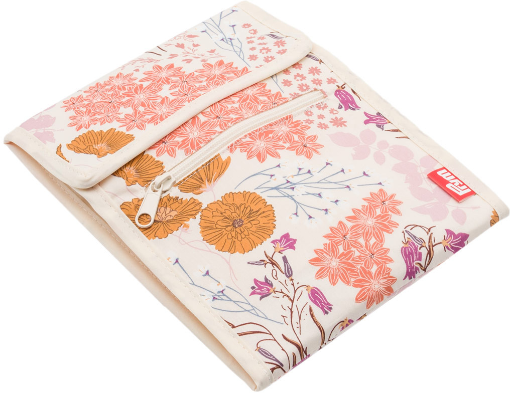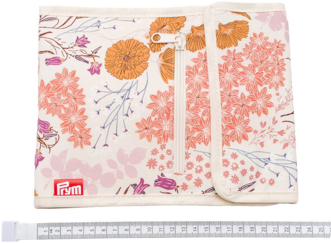 Цветочный принт в оранжевых, ярко-розовых и нежно-розовых тонах хорошо сочетается с внутренними карманами кремового цвета. Папка оснащена двумя кнопками для безопасности и удобства переноски ваших спиц.
