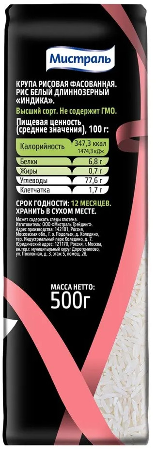 Соответствует всем стандартам качества. Это прекрасный источник калия. Помогает вывести из организма лишнюю жидкость и соль, проникающую в организм с продуктами питания. В рисе содержатся восемь жизненно важных для человека аминокислот, без которых невозможно создание новых клеток. Рис — продукт низкокалорийный и не жирный. Питая мышцы энергией, он не оставляет лишних килограммов. Обработка паром позволяет сохранить все полезные минералы и витамины. Благодаря красивой форме зерен и мягкому вкусу Индика является наиболее популярным в мире сортом длиннозерного риса и используется для приготовления всевозможных блюд.