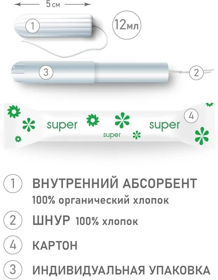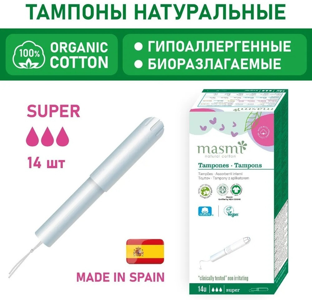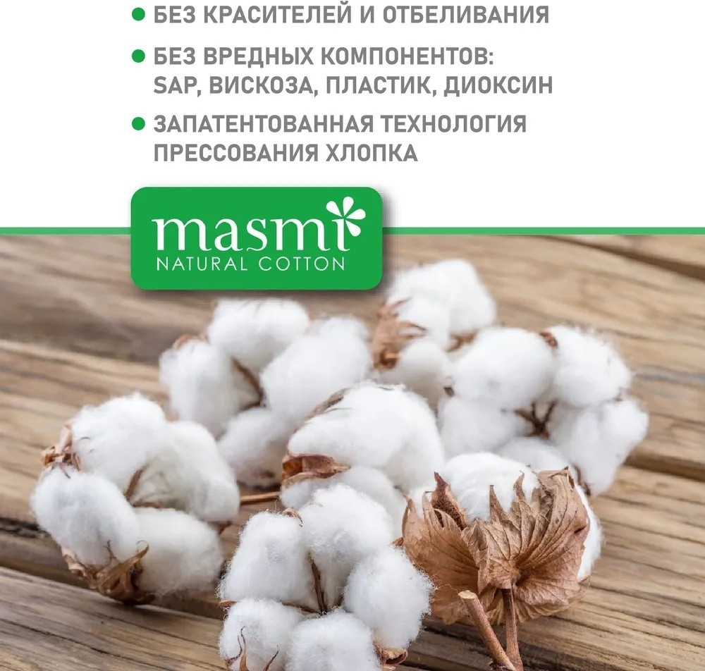 Натуральные тампоны с аппликатором Masmi Super сделаны из 100% органического хлопка и разработаны специально для нормальных и обильных выделений.