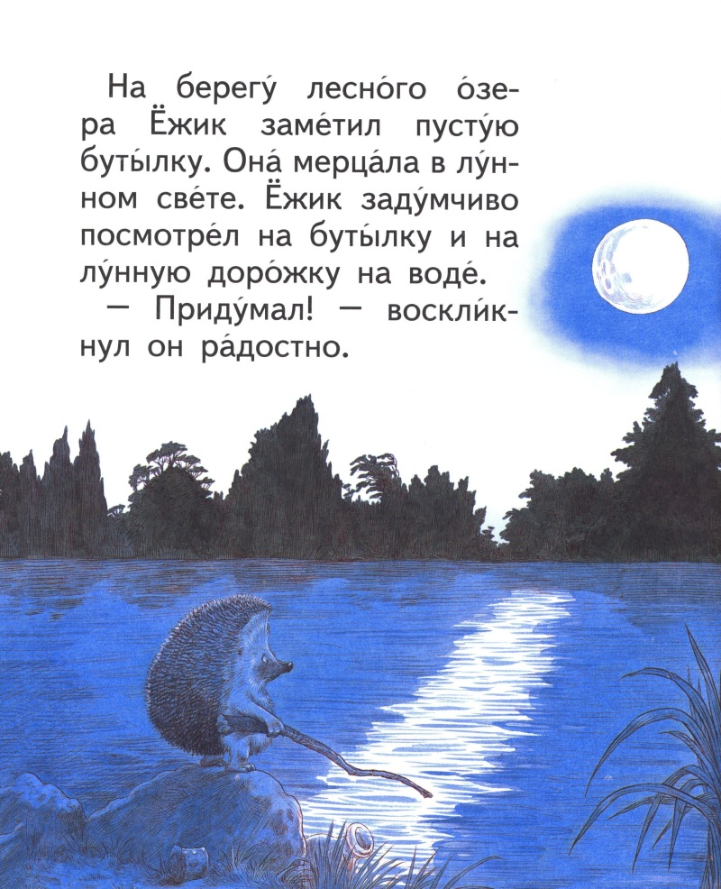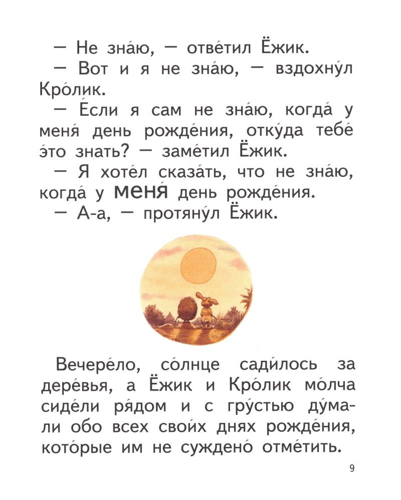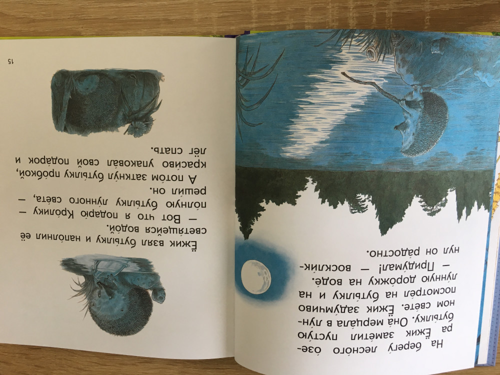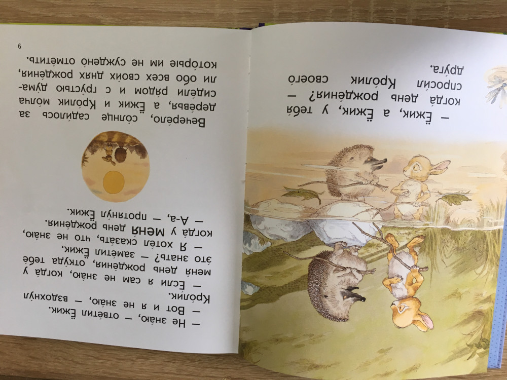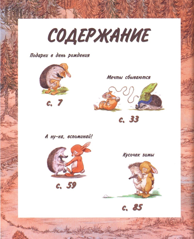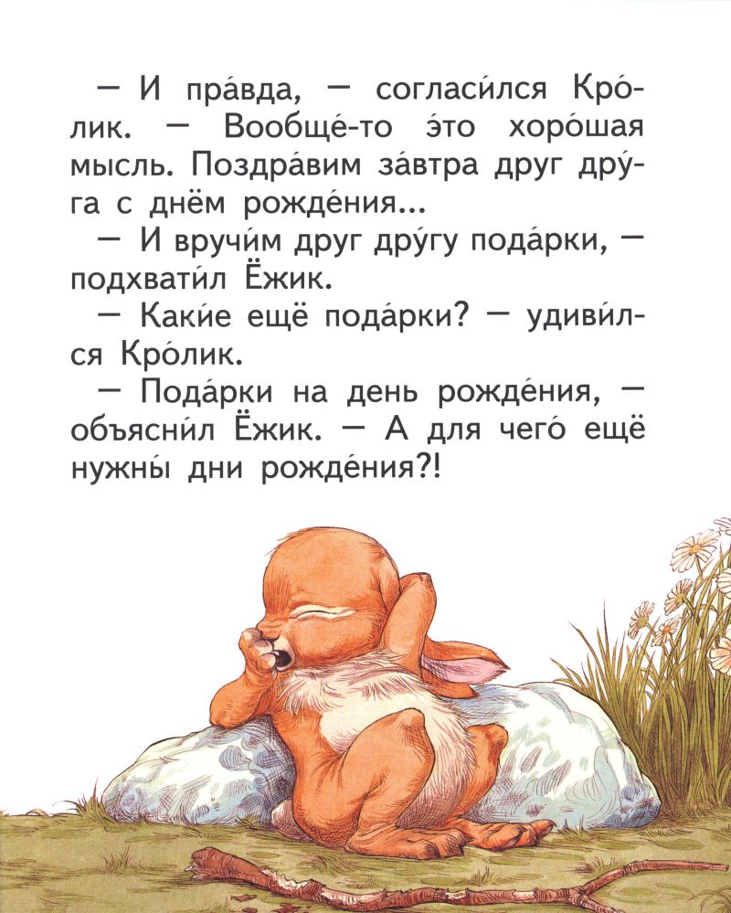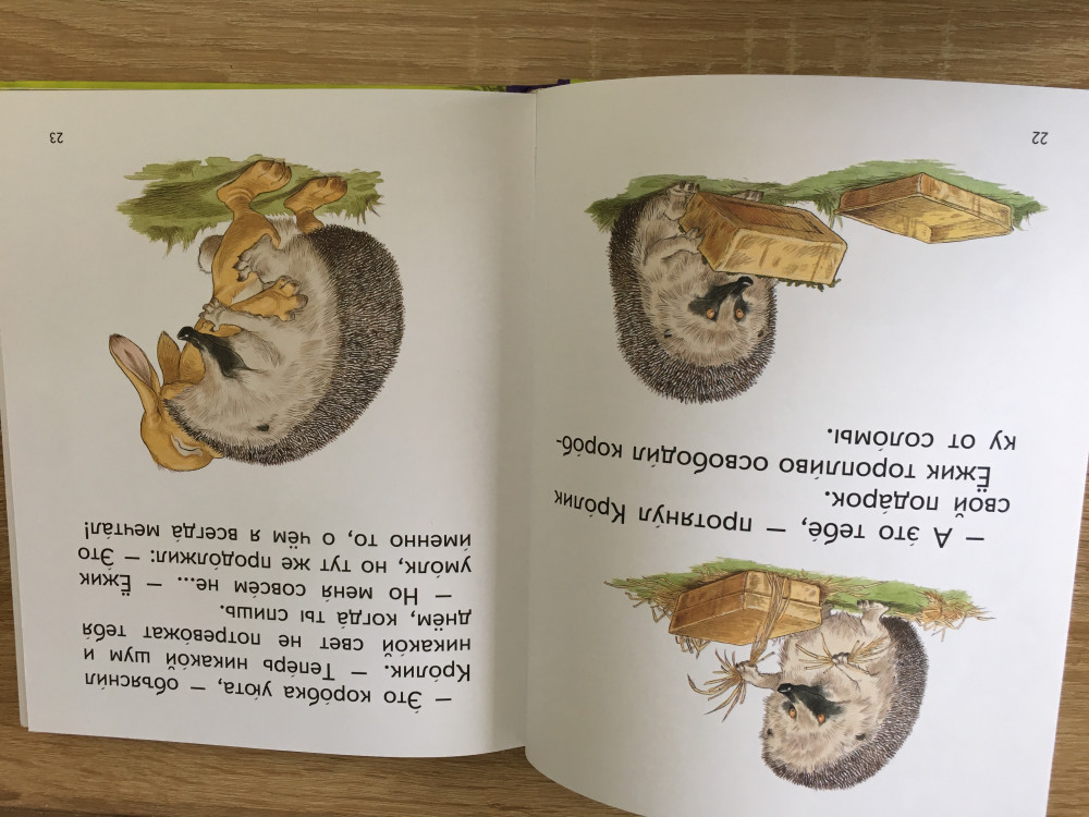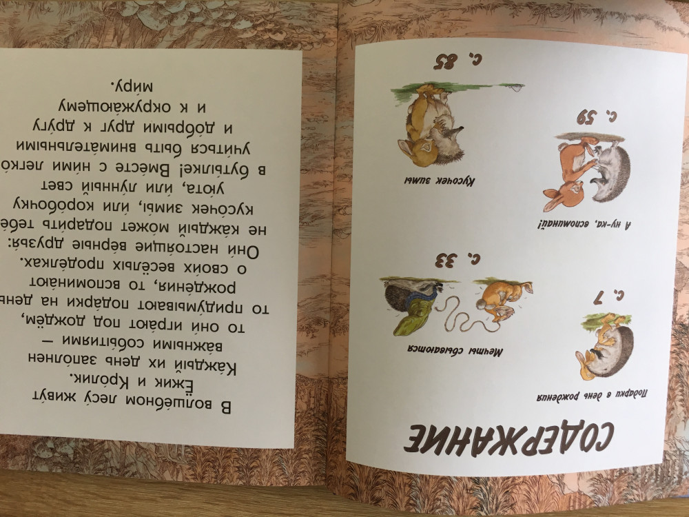Качество книги порадовало, оформление обложки интересное, ежик с кроликом выглядят как объемные. Страницы очень плотные, текст очень крупный, книга подходит для самостоятельного чтения. Бабушка с дедушкой читают эту книгу внуку без очков) Рисунки милые, но на них в основном только ежик и кролик, собственно как и в содержании. Истории подходят для чтения на ночь, хорошо под них засыпать)