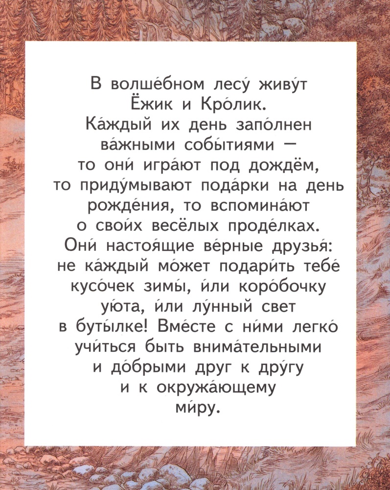 Захватили моих детей не только сами приключенческие рассказы о Кролике и Ежике, но и волшебные иллюстрации, тонко передающие настроения героев :)