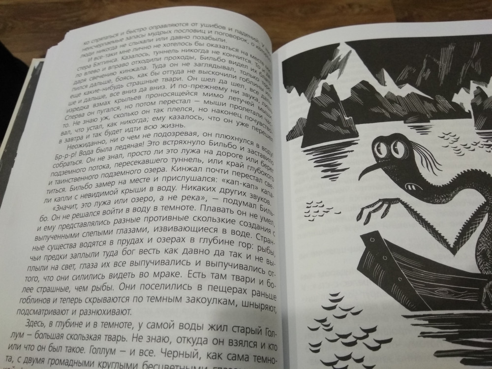 Книга чрезвычайно хороша! Обложка красивая, бумага приятная, присутствуют иллюстрации. Правда, не сказал бы, что иллюстрации мне особо понравились, да и перевод немного странный. Я оригинал не читал, поэтому в целом перевод меня полностью устраивает. За исключением того, как перевели имя Смауга и фамилию Торина, конечно. Рекомендую к прочтению
