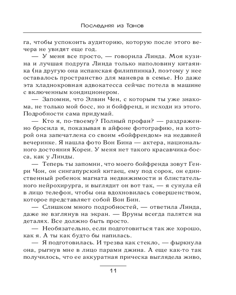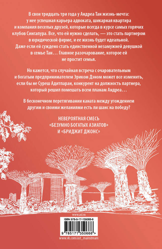 💳 Оплатить за товар можно при получении 🇰🇿 Есть бесплатная доставка по Казахстану от 1 дня 🎁 Копите бонусы с каждой покупки Серия: AsianRomance В свои тридцать три года у Андреа Тан жизнь-мечта: у нее успешная карьера адвоката, шикарная квартира и компания веселых друзей, которые всегда в курсе самых горячих клубов Сингапура. Все, что ей нужно сделать, — это стать партнером в юридической фирме, и ее жизнь будет идеальной. Даже если ей суждено стать единственной незамужней девушкой в семье Тан... Главное разочарование, которое ей не простит семья. Но кажется, что случайная встреча с очаровательным и богатым предпринимателем Эриком Дэном может все изменить, если бы не Суреш Адитпаран, конкурент на должность партнера, который решил помешать всем планам Андреа... В бесконечном перетягивании каната между угождением другим и своими желаниями есть ли шанс на победу? |