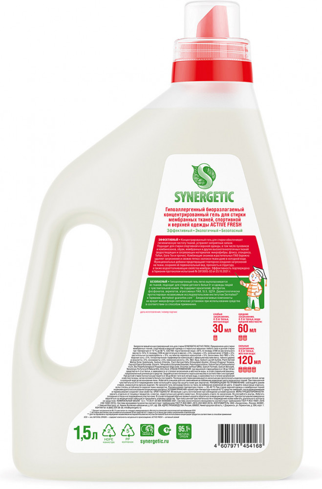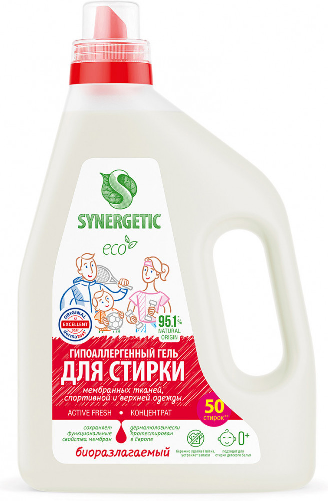 Биоразлагаемый концентрированный гель для стирки мембранных тканей, спортивной и верхней одежды Synergetic Active Fresh обеспечивает бережное и эффективное очищение тканей, гигиеническую чистоту одежды и устраняет неприятные запахи. Средство можно использовать в стиральных машинах любого типа и при ручной стирке при температуре 15 — 90 °C. Комбинация энзимов и растительных ПАВ эффективно удаляет трудновыводимые и свежие пятна с волокон ткани даже в холодной жесткой воде и при коротких циклах стирки. Функциональные добавки предотвращают повторное оседание загрязнений на ткани, сохраняя ее первоначальный вид, прочность и структуру, а также водоотталкивающие свойства мембран. Активные компоненты препятствуют образованию катышков, делая волокна более гладкими. Гипоаллергенная отдушка на основе эфирных масел мяты, чайного дерева и эвкалипта оставляет легкий и приятный аромат.Гель подходит для стирки спортивной и верхней одежды, в том числе пуховиков и комбинезонов, обуви, мембранных и других высокотехнологичных водоотводящих и согревающих материалов: микрофибры, флиса, спандекса, тканей Teflon и Gore-Tex. Биоразлагаемый гель полностью выполаскивается из тканей, подходит для стирки детского белья 0+ и одежды людей с чувствительной кожей.